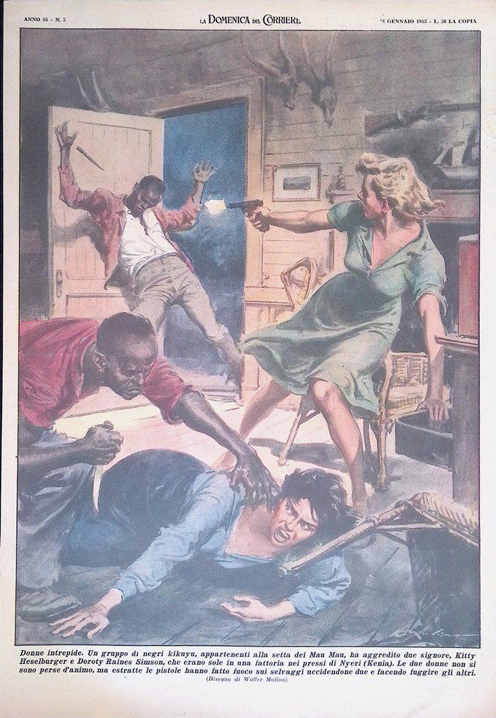 Un gruppo di negri Kikuyu della setta dei Mau Mau, ha aggredito due signore, Kitty Heselburger e Doroty Raines Simson in una fattoria nei pressi di Nyeri (Kenya). Le due donne si sono difese facendo fuoco sui selvaggi uccidendone due e facendo fuggire gli altri (Walter Molino)