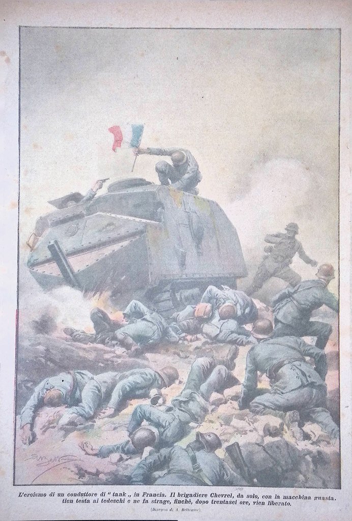 L'eroismo di un conduttore di "tank" in Francia. Il brigadiere Chevrel, da solo, con la macchina guasta tien testa ai tedeschi e ne fa strage, finché, dopo trentasei ore, vien liberato (Achille Beltrame)