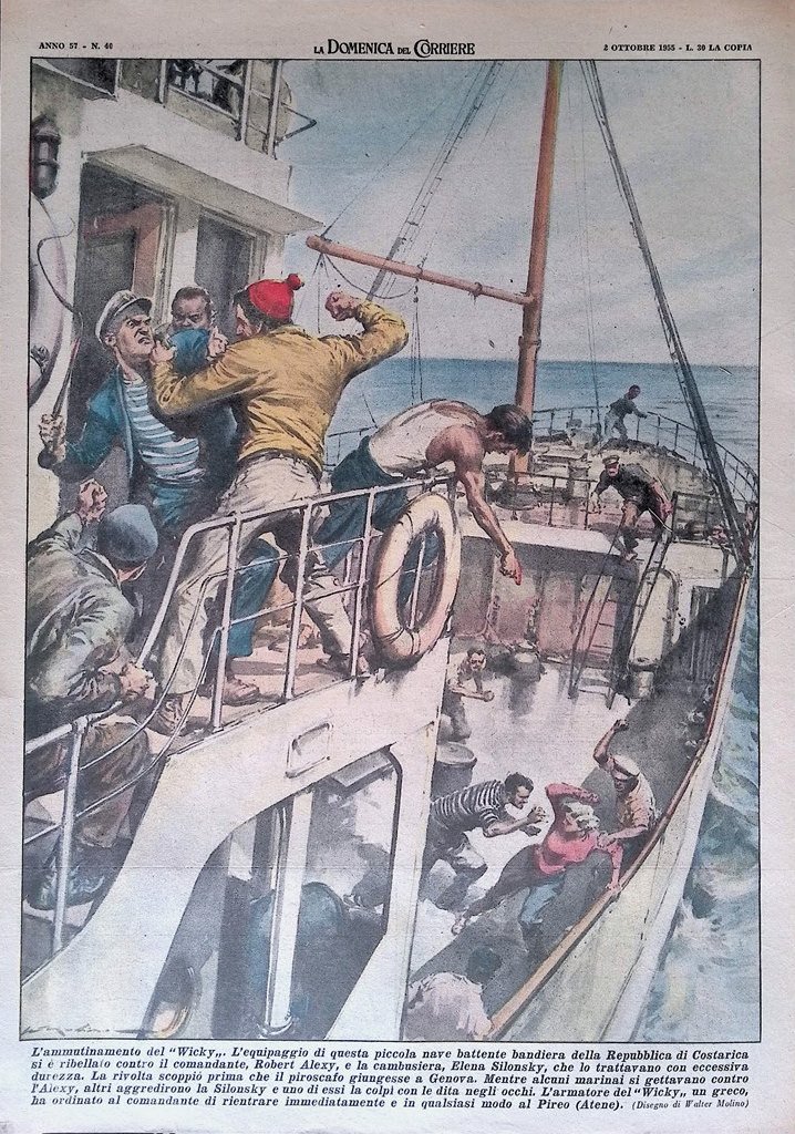 L'ammutinamento del "Wicky", piccola nave battente bandiera della Repubblica di Costarica . L'equipaggio si è ribellato contro il comandante Robert Alexy e la cambusiera Elena Silonsky che lo trattavano con eccessiva durezza. La rivolta scoppiò prima che il piroscafo giungesse a Genova (Walter Molino)