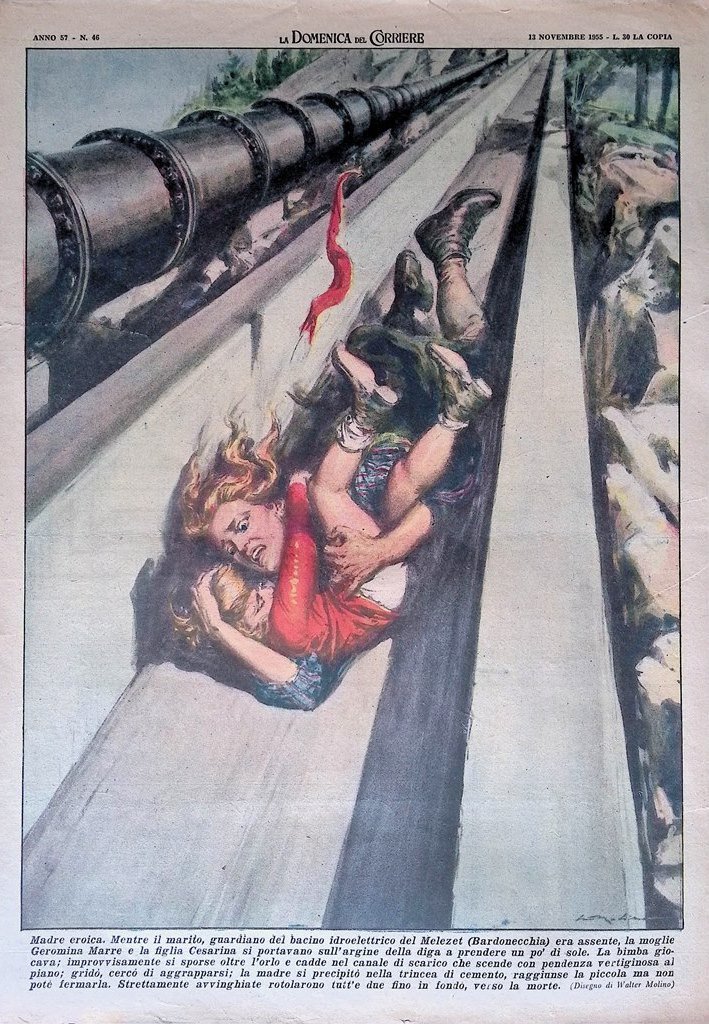 Madre eroica. Mentre il marito, guardiano del bacino idroelettrico del Melezet (Bardonecchia) era assente la moglie Geromina Marre e la figlia Cesarina si portavano sull'argine della diga ma cadevano nel canale di scarico trovando entrambe la morte (Walter Molino)
