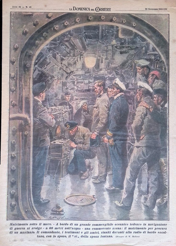 Matrimonio sotto il mare. A bordo di un grande sommergibile oceanico tedesco in navigazione di guerra, si svolge, a 60 metri sott'acqua, una commovente scena: il matrimonio per procura di un marinaio. Il comandante, i testimoni e gli amici, riuniti davanti alla radio di bordo, ascoltano, con lo sposo il "si" della sposa lontana (Walter Molino)