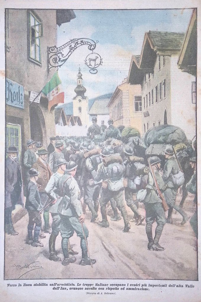 Verso la linea stabilita dall'armistizio. Le truppe italiane occupano i centri più importanti dell'alta Valle dell'Inn ovunque accolte con rispetto ed ammirazione (Achille Beltrame)