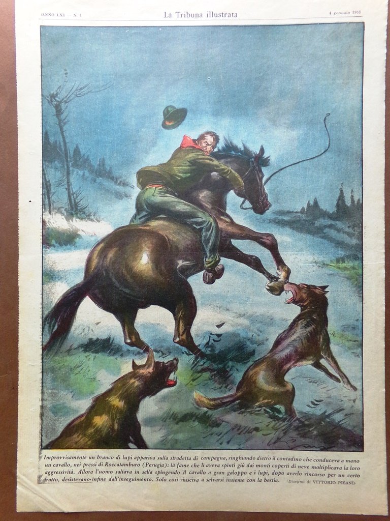 Improvvisamente un branco di lupi appariva sulla stradetta di campagna, ringhiando dietro il contadino che conduceva a mano un cavallo, nei pressi di Roccatamburo (Perugia): la fame che li aveva spinti giù dai monti coperti di neve moltiplicava la loro aggressività. Allora l'uomo saltava in sella spingendo il cavallo a gran galoppo e i lupi, dopo averlo rincorso per un certo tratto, desistevano infine dall'inseguimento. Solo così riusciva a salvarsi insieme con la bestia (disegno di Vittorio Pisani)