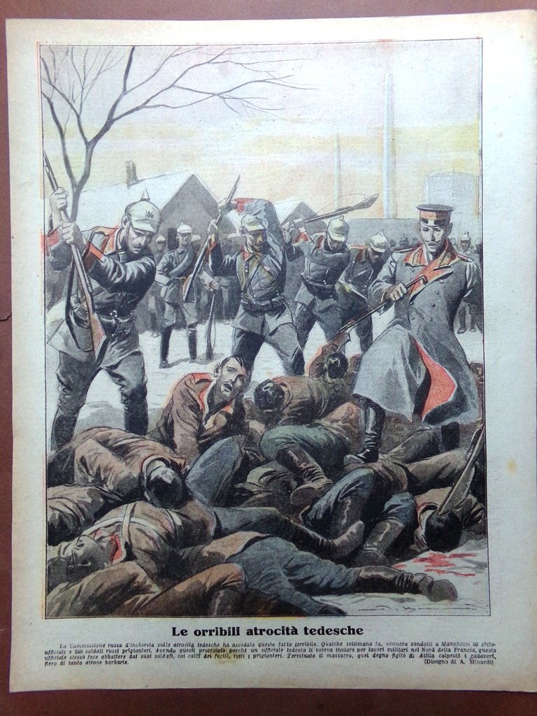 Le orribili atrocità tedesche: la commissione russa d'inchiesta sulle atrocità tedesche ha assodato questo fatto terribile. Qualche settimana fa, vennero condotti a Manheim 60 sottoufficiali e 240 soldati russi prigionieri. Avendo questi protestato perché un ufficiale tedesco li voleva inviare per lavori militari nel Nord della Francia, questo ufficiale stesso fece abbattere dai suoi soldati, coi calci dei fucili, tutti i prigionieri. Terminato il massacro, quel degno figlio di Attila calpestò i cadaveri, fiero di tanto atroce barbarie (A. Minardi)