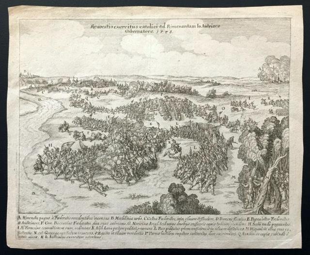 Incisione in rame all'acquaforte, senza data ma 1635 circa circa, b/n 22 x 27 (alla lastra). In primo piano la battaglia, legenda latina al margine inferiore (esiste anche una versione del Blaeu con legenda al margine superiore). Buono stato. Si tratta della battaglia di Rijmenam in Belgio, tra l'Esercito di Stato belga di Boussu e le truppe di Don Juan e i Farnese, 1 agosto 1578.Nobile famiglia laziale, i Farnese si distinguono come uomini d’arme. Alessandro Farnese, che trascorre l’infanzia a Parma, mostra subito interesse per le matematiche e l’arte militare. Nel 1571 ha modo di distinguersi nella battaglia di Lepanto e Don Juan d’Austria, zio di Alessandro e governatore dei Paesi Bassi, decide di designarlo come suo erede. Ecco che dopo aver assunto la carica di governatore dei Paesi Bassi, verso il 1586 crea il Ducato di Parma e Piacenza, assume il titolo di duca di Parma, Piacenza e Castro e chiede al re Filippo II di poter tornare a Parma; ma il re rifiuta ed egli deve affidare la reggenza al primogenito Ranuccio.