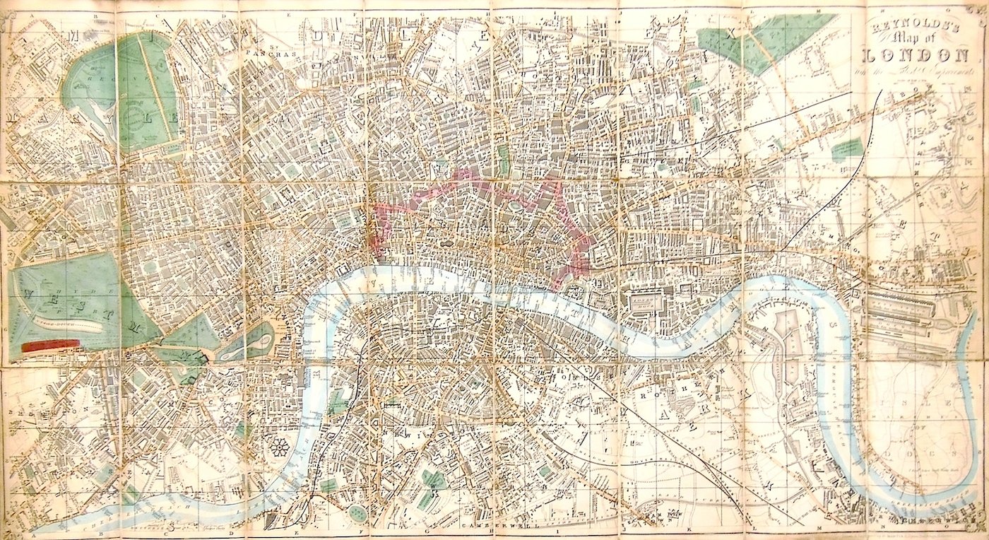 Silografia, colore originale a stampa, telata e ripiegatamm 420x760. Pianta della città delimitate da Kensington Gardens, Regent's Park, Victoria Park, East India Docks, Greenwich e Chelsea. Buono stato di conservazione, minime trace del tempo. <BR>