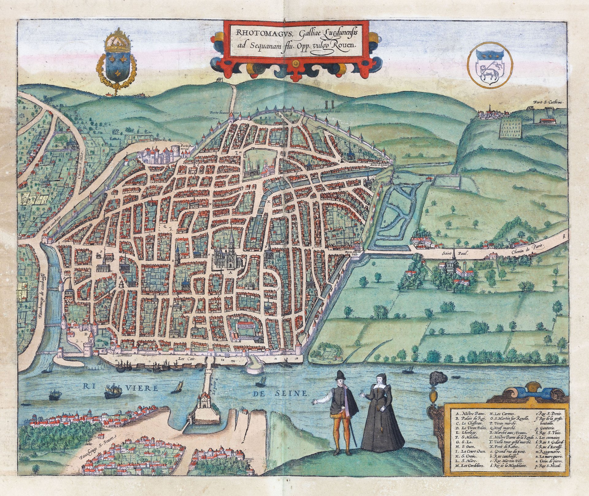 Incisione in rame, fascinosa coloritura d'epoca a mano, mm 305x378, testo latino al verso. Pianta prospettica orientata con la Senna in basso, mostra la fitta rete di strade, i principali edifici e le fortificazioni della città. I punti di riferimento più importanti, come la cattedrale di Rouen, sono rappresentati con grande evidenza. La campagna circostante è illustrata con dovizia di particolari, compresi campi, strade e insediamenti minori. La mappa comprende un cartiglio decorativo, due stemmi e una legenda in basso a destra che elenca i siti significativi della città. <BR>Tratta da "Civitates Orbis Terrarum", pietra miliare del vedutismo, stampata dal 1572 al 1617 in 6 volumi pubblicati in anni differenti in varie lingue, compilata e scritta da Georg Braun, mentre Frans Hogenberg fu autore delle incisioni insieme a Simon Novellanus, generalmente da soggetti di Hoefnagel. Ottime condizioni seppur con lievi ossidazioni. <BR>