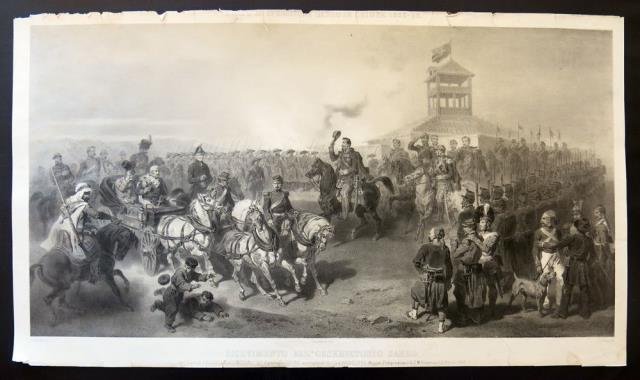 Torino, 1857. Tratta dall’album “Ricordo pittorico militare della spedizione sarda in Oriente negli anni 1855 - 56. Pubblicato d’ordine del Ministro di Guerra per cura del Corpo Reale di Stato Maggiore”. Litografia in tinta, b/n, cm 42 x 73 circa (il foglio), delineata da S. Grimaldi e litografata da A. Bayot. Bella raccolta iconografica e tecnica della guerra di Crimea. Rifilata in prossimità dei titoli con strappi ai margini (un paio toccano un poco l'inciso), buono tutto il figurato.