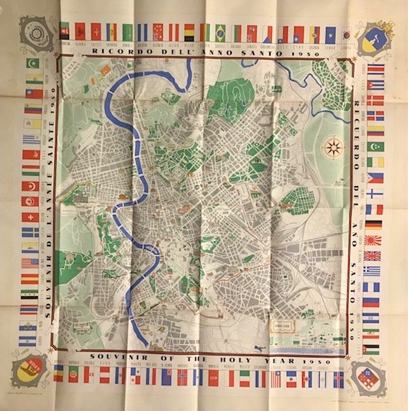 Cromolitografia originale a colori (cm. 100x100 più ampi margini bianchi) più volte ripiegata. Titolo in lingua italiana, spagnola, inglese e francese. La pianta è contornata da 76 bandiere delle principali nazioni del mondo; ai quattro angoli stemmi della città di Roma, dello Stato Vaticano, della Repubblica Italiana e della Marina Militare; in basso a destra territorio del lido di Ostia entro riquadro. Ottimo stato di conservazione. Rara.