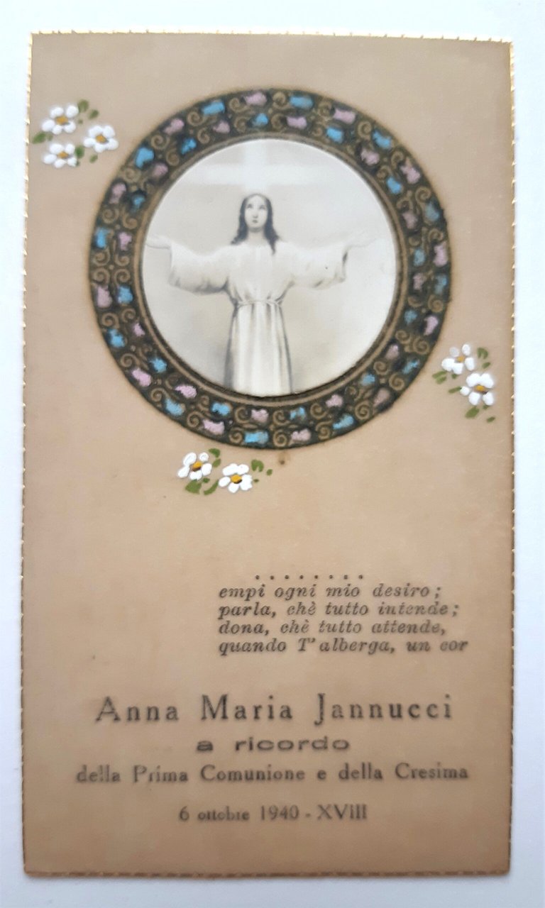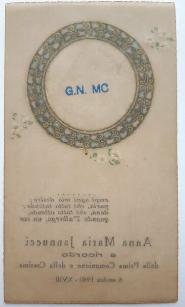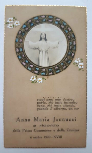 ricordo prima comunione su carta opaca con fiori e colori alla ghirlanda dipinti a mano, immagine applicata leggermente staccata al margine destro, in buono stato cm. 10,8 x 6,2