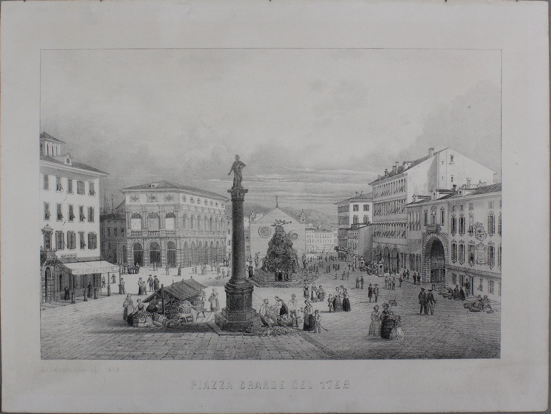 Litografia eseguita da Coen Colombo su disegno di Alberto Rieger (1834-1904), artista attivo a Trieste nella seconda metà del XIX secolo, che raffigura una veduta di Piazza Grande nel 1792.