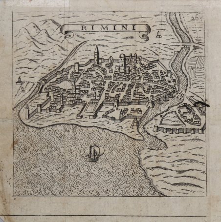Pianta della città ' tratta da "Itinerario, overo nova descrittione de' viaggi principali d'Italia […] di Francesco Scoto" edito a Venezia da Pietro Brigonci nel 1665.Le tavole pubblicate da Brigonci sono riconoscibili dal formato quadrato delle stampe.La sua prima edizione dell'Itinerario d'Italia fu nel 1665 ed aveva il testo ripreso dalla pubblicazione del Cadorin del 1659 la quale ampliava il racconto al Friuli, alla Sicilia, a Malta, al Lazio e alla Terrasanta, quindi nello stesso anno in una ristampa inseriva anche delle tavole su questi territori.Nel 1670, 1673, 1676 e 1679 si collocano le altre edizioni del Brigonci, tutte veneziane, tutte col titolo immutato "Itinerario, overo nova descrittione de' viaggi principali d'Italia […] di Francesco Scoto", tutte arricchite da poco meno di quaranta stampe antiche con vedute di città. Franz Schott (1548-1622), italianizzato come Francesco Scoto, era originario di Anversa. Giureconsulto e grande viaggiatore, fratello del più noto Andreas, gesuita, filologo e antiquario, redasse "Itinerario overo decrittione de' viaggi principali in Italia". L’opera apparve per la prima volta ad Anversa in occasione del Giubileo del 1600, con il titolo di Itinerari Italiae rerumq[ue] romanarum libri tres, ' stampata nell'Officina Plantiniana da Joannes Moretus. Priva dell'apparato iconografico, era intesa a servizio dei pellegrini che si recavano in Italia ed espressione di una particolare forma di scrittura odeporica che abbracciava tutti quei testi che assumono il carattere di guida per il viaggio e si offrono come strumento rivolto ad orientare il viaggiatore nel suo percorso. Ebbe un grande successo e venne poi pubblicata in numerose edizioni successive in latino, italiano, francese e inglese. L'Itinerario d'Italia ebbe il suo pieno sviluppo nelle numerose edizioni italiane, che furono riccamente illustrate da vedute prospettiche e piante delle città. La prima edizione italiana illustrata fu curata da Pietro Bertelli e Francesco Bolzetta (Vicenza o Venezia 1601); seguirono diverse edizioni di Bolzetta con un sempre crescente numero di illustrazioni cartografiche. Il testo di Schott venne usato per le proprie edizioni dell’Itinerario d’Italia anche da Matteo Cadorin (Padova 1654 e successive) e Pietro Bigonci (Venezia 1665). Anche a Roma, nell’anno giubilare 1650, l'editore Filippo de Rossi stampa l'Itinerario overo Nuova Descrittione de' Viaggi Principali d'Italia. Le stampe sono 19 a cui si aggiunge la mappa dell'Italia e risultano leggermente più accurate. Le tavole dell'edizione romana (realizzate tramite nuove lastre di rame) furono ristampate nelle edizioni successive - accresciute - dagli editori Michelangelo e Pier Vincenzo de Rossi (1669, 1700 e 1717) e quindi in quelle curate da Fausto Amidei, mercante di libri al Corso, che fece stampare da Antonio de Rossi nel 1737 la prime delle sue tre edizioni dell'Itinerario d'Italia ' di Francesco Scoto. Le altre furono nel 1747 nella stamperia del Bernabò e Lazzarini e nel 1761 nella stamperia di Generoso Salomoni. Acquaforte, consuete pieghe di carta editoriali, in ottimo stato di conservazione. Plate taken from ' "Itinerario, overo nova descrittione de' viaggi principali d'Italia [.] di Francesco Scoto" published in Venice by Pietro Brigonci in 1665. His first edition of the Itinerario was in 1665 and had the text taken from Cadorin's publication of 1659, which extended the story to Friuli, Sicily, Malta, Latium and the Holy Land, and in the same year a reprint also included plates on these territories. In 1670, 1673, 1676 and 1679 there were other editions by Brigonci, all Venetian, all with the unchanged title "Itinerario, overo nova descrittione de' viaggi principali d'Italia [.] di Francesco Scoto", all enriched with just under forty antique prints with views of cities. Franz Schott (1548-1622), Italianized as Francesco Scoto, was a native of Antwerp. A jurist and great traveler, brother of the better known Andreas, a Jesuit, philologist and antiquarian, he compiled "Itinerario overo decrittione de' viaggi principali in Italia." The work first appeared in Antwerp on the occasion of the Jubilee of 1600, under the title ' Itinerari Italiae rerumq[ue] romanarum libri tres, ' printed in the Officina Plantiniana by Joannes Moretus. Devoid of the iconographic apparatus, it was intended as a service to pilgrims traveling to Italy and an expression of a particular form of odeporic writing that embraced all those texts that take on the character of a travel guide and offer themselves as a tool aimed at orienting the traveler in his journey. It was a great success and was then published in numerous subsequent editions in Latin, Italian, French and English. The ' Itinerary of Italy ' had its full development in the numerous Italian editions, which were richly illustrated with perspective views and city plans. The first illustrated Italian edition was edited by Pietro Bertelli and Francesco Bolzetta (Vicenza or Venice 1601); several editions by Bolzetta followed with an increasing number of cartographic illustrations. Schott's text was also used for their own editions of the ' Itinerario d'Italia ' by Matteo Cadorin (Padua 1654 and later) and Pietro Bigonci (Venice 1665). Also in Rome, in the Jubilee year 1650, the publisher Filippo de Rossi printed ' Itinerario overo Nuova Descrittione de' Viaggi Principali d'Italia. ' There are 19 prints to which the map of Italy is added, and they are slightly more accurate. The plates of the Roman edition (made by means of new copper plates) were reprinted in later editions - augmented - by the publishers Michelangelo and Pier Vincenzo de Rossi (1669, 1700 and 1717) and then in those edited by Fausto Amidei, a book dealer on the Corso, who had Antonio de Rossi print the first of his three editions of Francesco Scoto's ' Itinerario d'Italia ' in 1737. The others were in 1747 in the printing house of Bernabò and Lazzarini and in 1761 in the printing hous