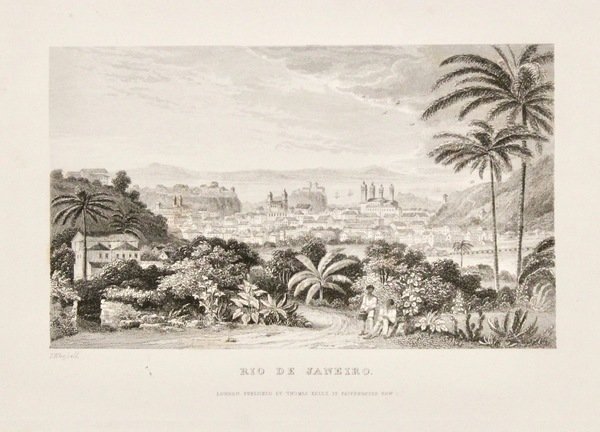 Incisione in acciaio di mm 103x170 (l'immagine) su foglio di mm 203x270 raffigurante una bella veduta della città brasiliana sullo sfondo. In primo piano vi sono due abitanti del luogo immersi nella lussureggiante vegetazione. Buone condizioni con leggere tracce di umidità marginali.