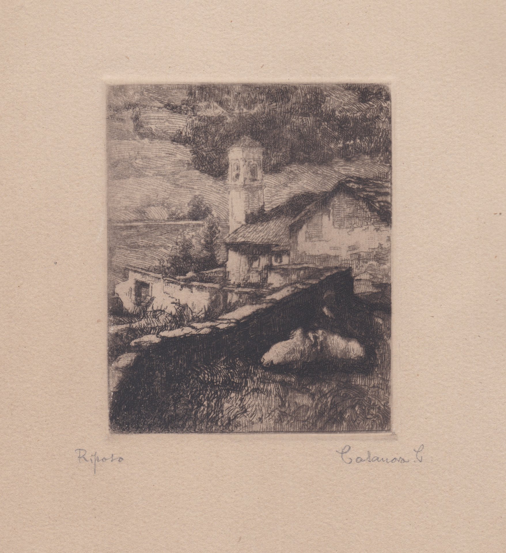 Questo soggetto, affrontato anche in una lastra realizzata un mese dopo con il titolo Riposo (n 17) e in un disegno a carboncino conservato presso gli eredi, è conosciuta inoltre con il titolo Chiesina a Mandrone - Val Stura o Balme dettaglio. Casanova, seppur partendo da un dettaglio dal vero da un significato evocativo alla composizione aggiungendo in primo piano una pastorella a riposo con due delle sue pecore. Le ombre scure in primo piano contrastano con la luce che colpisce le superfici dei prati, delle case e degli animali. Il tratto è corto, controllato e svelto, costruisce i volumi per accostamenti paralleli, l'intreccio distingue le zone in ombra. In basso nell'inciso, entro un rettangolo il monogramma CC. Oltre l'inciso a matita: Riposo, Casanova C.
