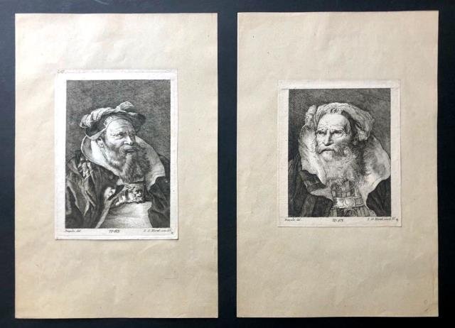 Coppia di incisioni in rame all’acquaforte e bulino, cm 13 x 15 (alla lastra) più margini; 12,8 x 17,8 (alla lastra) più margini. Disegnate da Giovanni Battista Tiepolo (1696 - 1770) e incise da Johann Georg Hertel (1719 - 1768). Esemplari ben impressi e in buono stato di conservazione. .