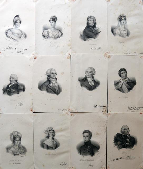 Lith. Delpech, 1830 circa. Litografie, b/n, cm 12,5 x 19 circa (il foglio). Disponiamo dei seguenti 13 ritratti: Bonaparte, Letizia Bonaparte, Maria Luisa, Josephine, Danton, Robespierre, Marat, Louis XVIII, Le Duc de Reichstadt, Louis Philippe I, Charlotte Corday, S. A. R. Madame La Dauphine, Pichegru. Raffinate le litografie. Margini rifilati, su alcuni il nome del personaggio manoscritto a inchiostro. .