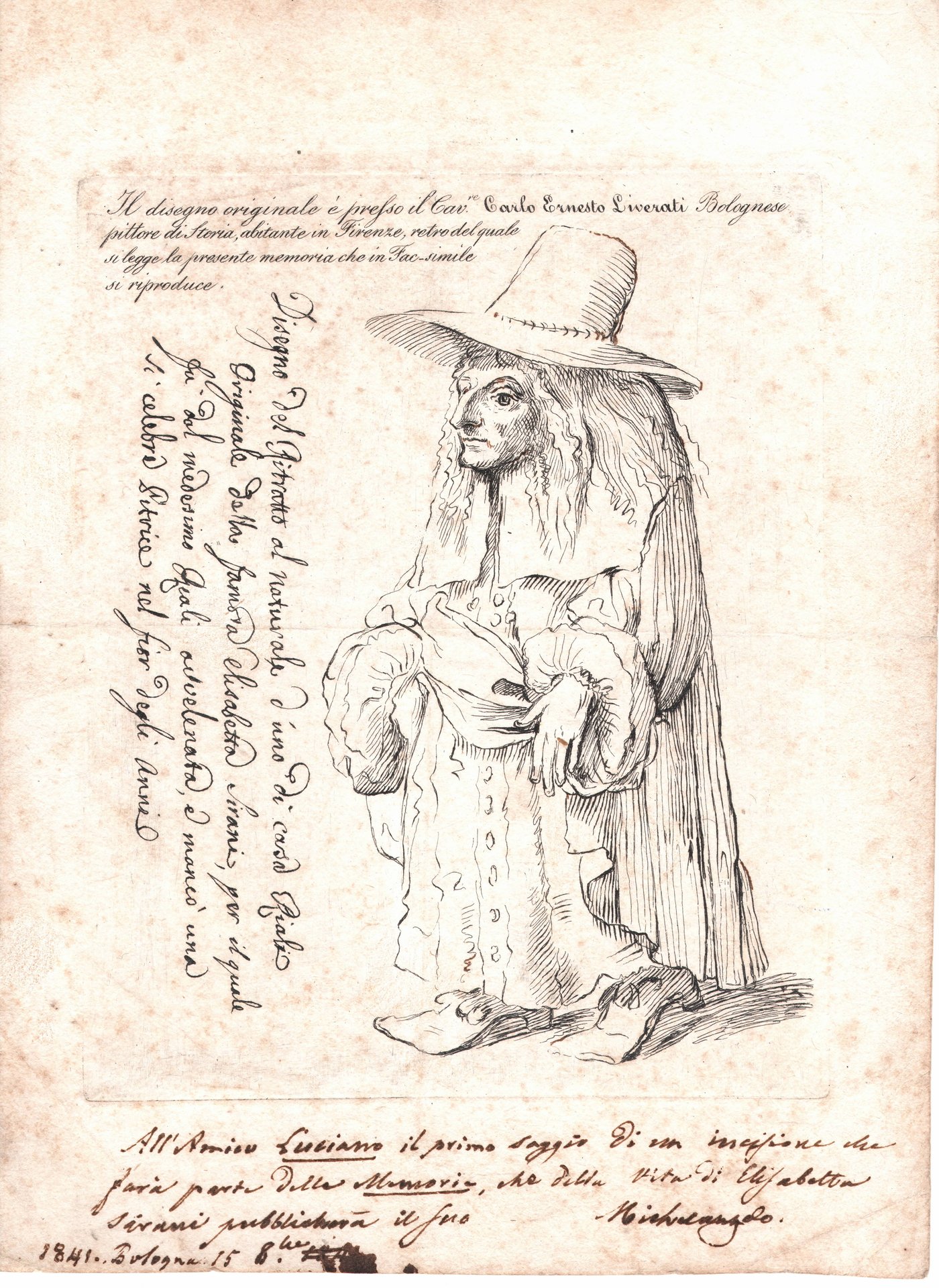 Nel foglio è riprodotto un disegno ritenuto autografo di Elisabetta Sirani (Bologna 1638 - Bologna 1665) all'epoca conservato presso il Cav. Carlo Ernesto Liverati pittore bolognese di storia ma residente a Firenze, così si legge inciso nella parte alta della lastra. Nella composizione vediamo incedere, da destra verso sinistra, una donna anziana; occhi sbarrati, naso aquilino e volto solcato da rughe, ella è avvolta in una veste troppo ampia peer la sua corporatura. Un cappello dalla falda larga poggia su capelli lunghi e disordinati. Nella lastra è incisa la scritta che si trova al retro del disegno: "Ritratto al naturale di uno di casa Riali, originale della famosa Elisabetta Sirani, per il quale fù dal medesimo Reali avvelenata, e mancò una si celebre pitrice nel fior degli anni". Elisabetta Sirani infatti fu avvelenata dal una serva di casa. Sul foglio, nel margine inferiore bianco, dedica manoscritta a penna dell'autore: All'Amico Luciano il primo saggio di un'incisione che farà parte delle Memoria, che della vita di Elisabetta Sirani pubblicherà il suo Michelangelo. 1841. Bologna 15 . Il riferimento della dedica è al volume effettivamente pubblicato da Michelangelo