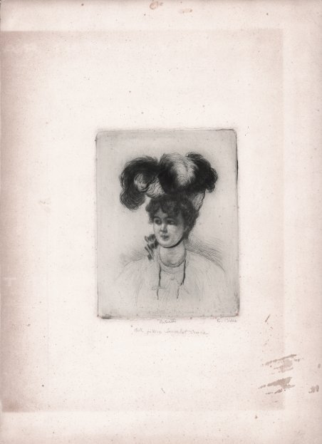Acquaforte e puntasecca, circa 1900. Titolo a matita in basso e firma autografa in basso a destra “C. Biseo”. Magnifica prova, impressa con inchiostro verde su carta coeva, tracce di antica inquadratura, per il resto in eccellente stato di conservazione. Marcelle Renée Lancelot, coniugata Croce (Parigi, 26 gennaio 1854 – ca 1946), è stata una pittrice, scultrice e medaglista francese naturalizzata italiana. In seguito al matrimonio con lo scultore Leonardo Croce, prese la nazionalità italiana, cambiando il nome in Marcella. Visse per diversi anni a Roma, a partire dal 1895. Oltre alla pittura e alla scultura, si dedicò anche fin da giovane alla professione di medaglista. Cesare Biseo pittore, acquarellista e incisore, nasce a Roma, ove il padre, Gian Battista, valente pittore accademico di Brescia, si era da poco trasferito essendo stato chiamato a decorare il castello di Bracciano. Riceve dunque dal padre i primi insegnamenti artistici e, a seguito del genitore, trascorre da giovane un lungo periodo a Parigi. Nel 1869, in occasione dell’inaugurazione del Canale di Suez, il Kedivé d’Egitto lo chiama a decorare prima il suo palazzo in Alessandria e poi il Teatro dell’Opera al Cairo. ' ' Innamoratosi dell’Africa la visita più volte e nel 1875 con Edmondo De Amicis e il pittore Stefano Ussi fa parte della prima missione italiana in Marocco. Ne trae diversi albi di schizzi, che utilizza per illustrare, insieme ad Ussi, il libro di De Amicis, Marocco, edito nel 1877 dalla casa editrice Treves di Milano. Nello stesso anno accompagna De Amicis a Costantinopoli, illustrando poi l’omonimo libro dello scrittore pubblicato nel ’78 sempre dalla Treves. Il grande successo di entrambe le edizioni consacra Biseo “orientalista”, spingendolo ad intensificare la produzione di oli ed acquarelli a soggetto arabo. Intanto nel 1875, assieme a E. Roesler Franz e N. Cipriani, fonda a Roma la Società degli Acquerellisti, di cui diviene presidente nel 1881. La vena orientalista, infatti, non gli aveva fatto dimenticare la passione per i paesaggi della Campagna Romana, ritratti con grande fedeltà ed originali tagli di luce (“l’ardito effetto di sole”), evolvendo dall’originario gusto classico verso soluzioni sempre più veriste. Lo troviamo anche tra i soci fondatori del Gruppo dei XXV della Campagna romana, ove Pascarella gli affibbia il nomignolo di “cariate” per i suoi trascorsi egiziani. Ebbe lo studio a via Margutta e fu, come le foto di Oreste Sgambati stanno a dimostrare, un frequentatore assiduo del Caffè Greco, dove fu soprannominato “professorissimo” per la sua maestria a biliardo. Oltre agli affreschi ed alle decorazioni degli esordi, dipinge ugualmente bene ad olio e all’acquarello. Si è inoltre dedicato con successo all’acquaforte, come dimostrano le sue bellissime illustrazioni di libri. Il presente ritratto di Marcella Lancelot Croce, confrontando le biografie dei due artisti, risale al periodo tra il 1895 e il 1909, tra l'arrivo della pittrice a Roma e la scomparsa di Biseo. Opera non descritta da nessuno dei repertori consultati. Molto rara. Etching and drypoint, circa 1900. Title in pencil at bottom and autograph signature at bottom right "C. Biseo". ' Magnificent example, impressed in green ink on coeval paper, traces of old framing, otherwise in excellent condition. Marcelle Renée Lancelot (Paris, January 26, 1854 - ca 1946) was a French painter, sculptor and medallist naturalized Italian. Following her marriage to the sculptor Leonardo Croce, she took Italian nationality, changing her name to Marcella. She lived for several years in Rome, starting in 1895. In addition to painting and sculpture, she devoted herself to the profession of medallist since she was young. ' The present portrait of Marcella Lancelot Croce, comparing the biographies of the two artists, dates from the period between 1895 and 1909, between the painter's arrival in Rome and Biseo's death. Work not described by any of the repertories consulted. Very rare. Cesare Biseo painter, watercolorist and engraver, was born in Rome, where his father, Gian Battista, a talented academic painter from Brescia, had recently moved to decorate the castle of Bracciano. Receives therefore from the father the first artistic teachings and, following the parent, spends as a young man a long period in Paris. In 1869, on the occasion of the inauguration of the Suez Canal, the Kedivé of Egypt called him to decorate first his palace in Alexandria and then the Opera House in Cairo. ' ' Having fallen in love with Africa, he visited it several times and in 1875 with Edmondo De Amicis and the painter Stefano Ussi was part of the first Italian mission to Morocco. It draws several albums of sketches, which used to illustrate, along with Ussi, the book of De Amicis, Morocco, published in 1877 by the publisher Treves in Milan. In the same year accompanies De Amicis in Constantinople, then illustrating the homonymous book of the writer published in '78 always by Treves. The great success of both editions consecrates Biseo "orientalist", pushing him to intensify the production of oils and watercolors to Arab subject. Meanwhile in 1875, along with E. Roesler Franz and N. Cipriani, founded in Rome the Society of Watercolorists, of which he became president in 1881. The orientalist vein, in fact, had not made him forget the passion for the landscapes of the Roman countryside, portrayed with great fidelity and original cuts of light ("the bold effect of the sun"), evolving from the original classical taste towards more and more realistic solutions. We also find him among the founding members of the Group of XXV of the Roman Countryside, where Pascarella gives him the nickname of "cariate" for his Egyptian past. He had a studio in Via Margutta and was, as the photos of Oreste Sgambati demonstrate, a frequent visitor to the Caffè Greco, where he was nicknamed "professorissimo" for his mastery at billiards. In a