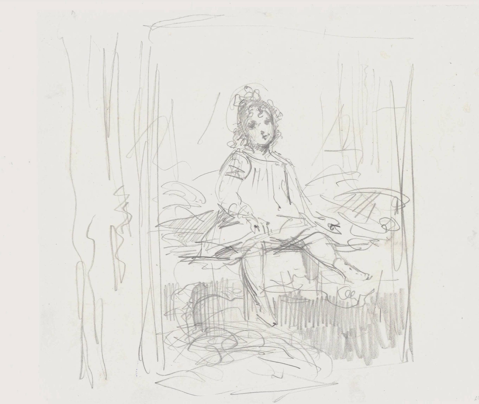 In questo foglio l'artista mostra allo spettatore l'interno della camera di una fanciulla, la scena è racchiusa fra due tende che creano quasi una quinta teatrale. Con un segno immediato l'autore riproduce dal vero una scena di intimità familiare. La bimba è seduta sul letto, forse si è appena svegliata, il volto vispo e frontale cerca lo sguardo dello spettatore. La forza ed essenzialità del tratto con cui è disegnato l'arredo si pone in contrasto con la cura e sensibilità con cui è resa l'espressione del volto. Il disegno, di notevole padronanza e freschezza, è attribuito allo scultore francese secondo le indicazioni presenti sul vecchio montaggio oggi perduto.