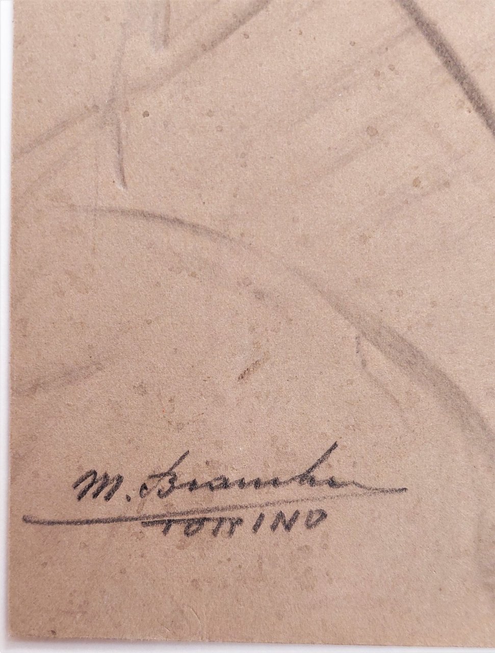 Disegno firmato in basso a sinistra M. Bianchi Torino, carboncino e biacca di ottima mano su cartoncino, una macchia di umidità sulla parte sinistra del foglio, due pieghe sempre sulla parte sinistra del foglio, piccole macchie e segni, una piccola mancanza al margine inferiore, come da immagine. Al verso un bozzetto appena accennato sempre dello stesso soggetto, qualche piccola macchia.