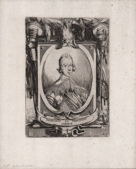 Acquaforte, 1634 circa, firmata in basso a destra con il monogramma SDB; iscrizione latina nel cartiglio sotto il ritratto: FRANCISCUS EX PRINCIPIBUS / ETRURIAE. Magnifico esemplare, stampato su carta vergata coeva, ampi margini, in ottime condizioni. Ritratto in ovale di Francesco de' Medici (16 ottobre 1614 - 25 luglio 1634), figlio di Cosimo II, all'età di 19 anni, busto a ¾, rivolto a destra, cornice decorata con armi. Francesco era il quarto figlio del Granduca Cosimo II di Toscana e di sua moglie, Maria Maddalena d'Austria. Celibe, morì di peste durante l'assedio di Ratisbona, 1634. Il ritratto di Della Bella deve essere stato ' realizzato postumo per il libro funebre Esequie del Serenissimo Principe Francesco celebrate in Fiorenza.il dì 30 d'agosto 1634, descritte da Andrea Cavalcanti edito da Landini a Firenze nel 1634 . La sua probabile fonte è il ritratto di Francesco di Justus Susterman negli Appartamenti Reali di Palazzo Pitti. La testa e i lineamenti sembrano essere gli stessi, anche se invertiti nell'incisione. L'armatura, il colletto di pizzo sono simili. Della Bella mostra Francesco senza cappello, e presumibilmente con i propri capelli, piuttosto che con la parrucca del ritratto dipinto. Stefano della Bella fu uno degli incisori più interessanti e originali nella Firenze del XVII secolo e può considerarsi l’unico geniale continuatore dell’opera di Jacques Callot. La sua educazione artistica ebbe inizio a Firenze nella bottega degli orafi Gasparo Mola e Orazio Vanni, e la precisione del segno, tipica dell’arte orafa resterà caratteristica del suo stile. Studiò poi presso Giovanni Battista Vanni e forse anche presso il Cantagallina e Cesare Dandini, ma ben presto si dedicò all'incisione. Il suo vero maestro può considerarsi Jacques Callot, l’incisore francese che soggiornò a lungo a Firenze lasciando una forte impronta nel panorama artistico della città. Gli anni più importanti della sua carriera sono quelli che trascorre a Parigi, dal 1639 al 1650, stipendiato da Lorenzo de' Medici: lavorò insieme ad Israel Silvestre, con gli editori Langlois, Ciartres e Pierre Mariette, per stampatori francesi e per commissioni di gran prestigio, come quelle del 1641 per il cardinale Richelieu che gli affidò le illustrazioni delle sue imprese guerresche. Intorno al 1647, durante un viaggio in Olanda, dove eseguì le acqueforti con le vedute del porto di Amsterdam, incontrò Rembrandt e da quella data notiamo una eco profonda dell’arte dell’olandese nella grafica del Della Bella. Bibliografia De Vesme – Massar, n. 36, p. 54; J. Talbierska, Stefano della Bella: Etchings from the Collection of the Print Room of the Warsaw University Library. Warsaw, 2001, cat. n. 10, p. 43. Etching, 1634 circa, signed at the bottom on the right with bound monogram SDB; latin inscription in ' the cartouche FRANCISCUS EX PRINCIPIBUS / ETRURIAE. Magnificent example, printed on contemporary laid paper, wide margins, in excellent condition. ' Portrait in oval of Francesco de’ Medici (16 October 1614 – 25 July 1634), son of Cosimo II, at his age of 19, bust ¾ to the right, flanked by arms. He was the fourth son of Grand Duke Cosimo II of Tuscany and his wife, Maria Maddalena of Austria. He died, unmarried, from plague during the Siege of Ratisbon, 1634. The portrait by Della Bella must have been made posthumously for Francesco's funeral book, published in 1634 Esequie del Serenissimo Principe Francesco celebrate in Fiorenza…il dì 30 d’agosto 1634, descritte da Andrea Cavalcanti (Landini, 1634) . Its probable source is the portrait of Francesco by Justus Susterman in the Royal Apartments at the Pitti Palace. The head and features appear to be the same, though reversed in the etching. The armor, lace collar, and scarf are similar. Della Bella shows Francesco hatless, and presumably with his own hair, rather than in the wig of the painted portrait. ' Stefano della Bella was one of the most interesting and original engravers in 17th-century Florence and can be considered the only brilliant continuator of Jacques Callot's work. His artistic education began in Florence in the workshop of the goldsmiths Gasparo Mola and Orazio Vanni, and the precision of sign, typical of the goldsmith's art, will remain characteristic of his style. He then studied under Giovanni Battista Vanni and perhaps also under Cantagallina and Cesare Dandini, but soon turned to engraving. His real master can be considered Jacques Callot, the French engraver who stayed in Florence for a long time and left a strong imprint on the city's artistic scene. The most important years of his career were the ones he spent in Paris, from 1639 to 1650, salaried by Lorenzo de' Medici: he worked together with Israel Silvestre, with the publishers Langlois, Ciartres and Pierre Mariette, for French printers and for commissions of great prestige, such as those of 1641 for Cardinal Richelieu, who entrusted him with illustrations of his warlike exploits. Around 1647, during a trip to Holland, where he executed etchings with views of the port of Amsterdam, he met Rembrandt, and from that date we note a profound echo of the Dutchman's art in Della Bella's graphic work. ' Bibliografia De Vesme – Massar, n. 36, p. 54; J. Talbierska, Stefano della Bella: Etchings from the Collection of the Print Room of the Warsaw University Library. Warsaw, 2001, cat. n. 10, p. 43. Cfr.