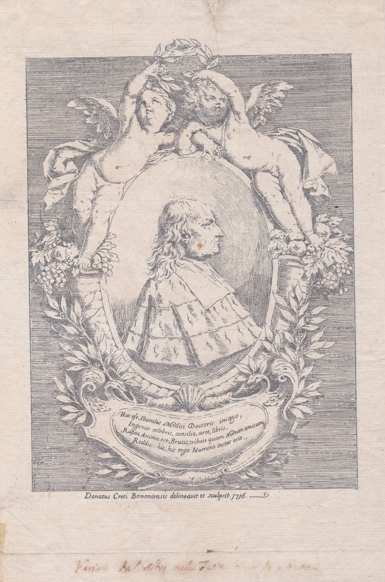 Ritratto di Giovanni Girolamo Sbaraglia medico e anatomista italiano (Bologna 1641 - Bologna 1710) raffigurato all'interno di un ovale. La cornice è decisamente elaborata, due putti in piedi su cornucopie colme di frutta e foglie reggono tra le mani una corona di alloro posta idealmente sul capo del medico. I due putti rivolgono il volto uno a destra l'altro a sinistra, tale dettaglio distingue l'incisione dall'altra di medesimo formato e soggetto con i putti entrambi rivolti a sinistra. Nel margine inferiore a penna in grafia antica: variante dall'altra nelle facce ... de i puttini. Sotto il ritratto un elaborato cartiglio con quattro versi in latino celebrano l'effigiato. In basso oltre l'immagine è inciso: Donatus Creti Bononiensis delineavit et sculpsit 1716. Esemplare nel II/II stato con il testo inciso. A Berlino si conserva un esemplare stampato in verde. Rara da reperire completa delle zone bianche tra inciso e bordo della lastra.