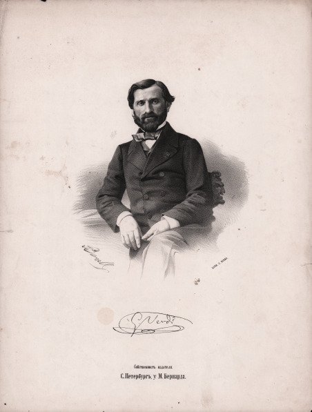 Ritratto di un giovane Giuseppe Verdi, pubblicato dalla Litografia Dines ed eseguito da Pere Borrell del Caso, 1865/70 circa. Borrell del Caso (Puigcerdà, 1835 – Barcellona, 16 maggio 1910) è stato un pittore, illustratore e incisore spagnolo, conosciuto per il suo dipinto Escapando de la crítica (1874), esempio di trompe l'œil. Borrell del Caso fu anche autore di molti ritratti e scenari religiosi, influenzati dalla pittura dei Nazareni. Per due volte gli fu offerta la cattedra della Scuola della Llotja e in entrambi i casi rifiutò, creando un'accademia indipendente. Litografia, leggere ossidazioni nella parte sinistra, per il resto in buono stato di conservazione. Portrait of a young Giuseppe Verdi, published by Litografia Dines Lithography and executed by Pere Borrell del Caso, ca. 1865/70. Borrell del Caso (13 December 1835, in Puigcerdà – 16 May 1910, in Barcelona) was a Spanish painter, illustrator and engraver, known for his trompe-l'œil paintings; especially Escapando de la crítica (1874). His father was a cabinetmaker who taught that craft to Borrell. It was by this means that he was able to support his studies at the School of Fine Arts. He also painted portraits, which made up the bulk of his work, and created religious murals in the Nazarene style in Barcelona, Girona and Castellar del Vallès. These, however, were all destroyed during the Spanish Civil War in the 1930s. He exhibited throughout Spain and at the 1878 Exposition Universelle. He was twice offered a professorship at the Escola de la Llotja, but preferred to teach at his own private art school. Those who studied there or were influenced by his work include Romà Ribera, Ricard Canals, Adrià Gual and Josep Maria Sert. Lithograph, slight oxidation on left side, otherwise in good condition. Cfr.