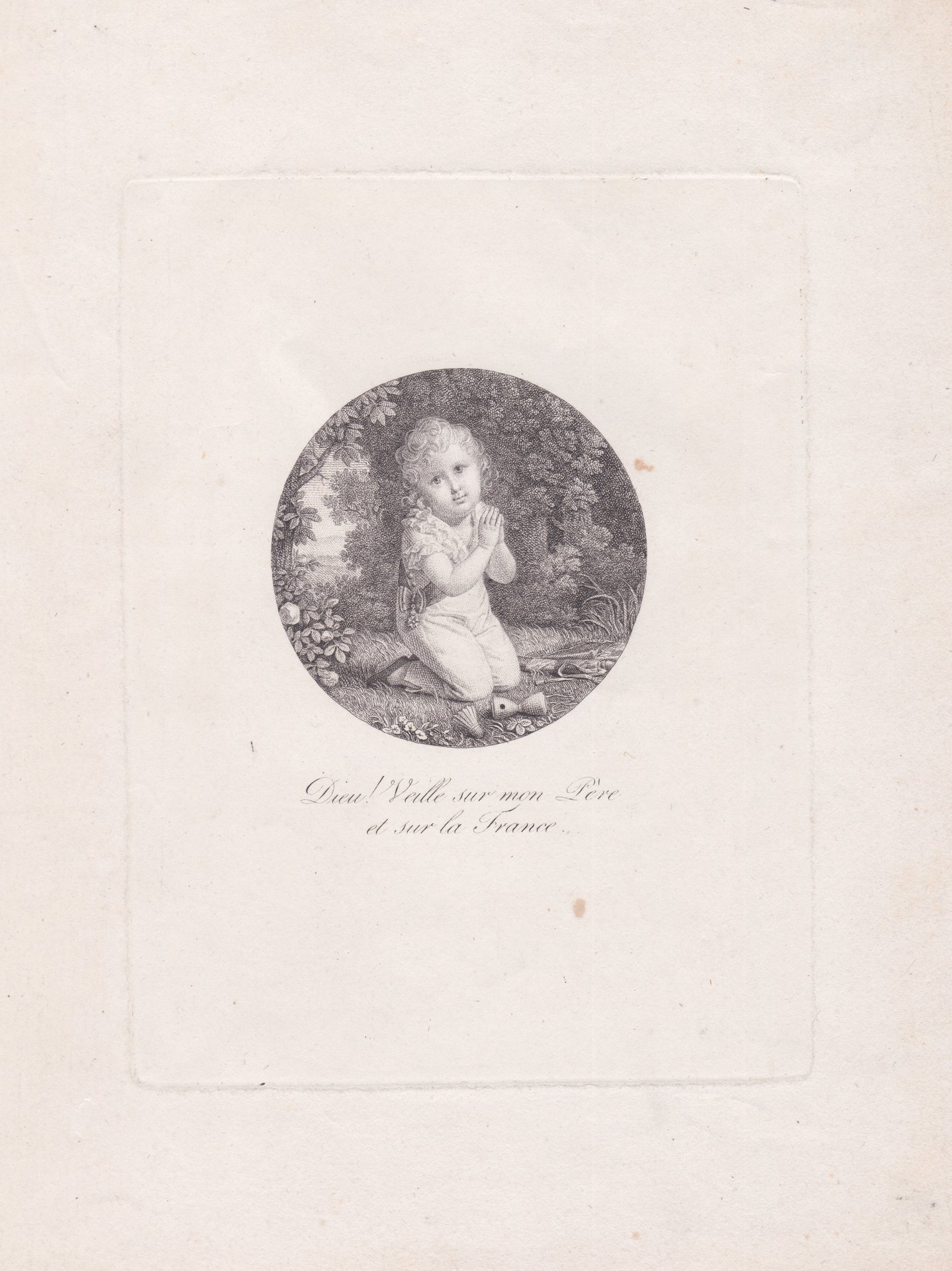 Ritratto di Napoleone Francesco Giuseppe Carlo Bonaparte (Parigi 1811-Vienna 1832) bambino, poi Napoleone II Imperatore dei francesi, quindi Franz Duca di Reichstadt. Si conoscono diverse versioni del soggetto distinguibili per i diversi abiti indossati da Napoleone, per la presenza di giocattoli o fiori e per la descrizione dei dettagli nel paesaggio. Tutte le versioni traducono una miniatura di Aimée Thibault (Bordeaux 1784 – Parigi 1868). Il 20 Febbraio 1814 L’Imperatrice Maria Luisa offre a Napoleone una scatola decorata con una miniatura di Thibault raffigurante il Re di Roma inginocchiato in preghiera con un uniforme Polacca. Il giorno successivo Napoleone ordina di eseguire un incisione della miniatura con la scritta “Dio veglia su mio padre e sulla Francia”. Il 27 Febbraio Napoleone chiede che la scritta sia modificata con “Io prego Dio per mio padre e per la Francia” e che in alcuni esemplari l’uniforme sia modifica con quella della Guardia Nazionale. Esemplare nel I/II stato con la scritta nella prima versione. Presso la Bnf si conserva un esemplare nello stato successivo, con la frase mutata secondo l’indicazione di Napoleone stesso.