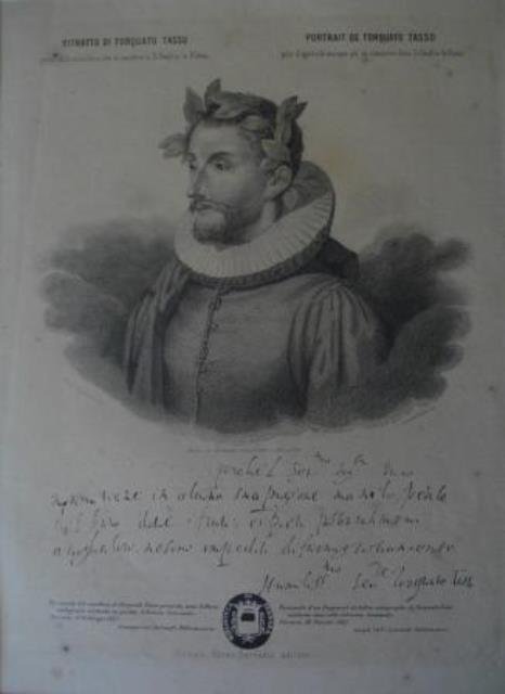 Torino, Litografia Giordana, Grand Didier e Salussolia, Ferarra Abram Servadio Editore, metà XIX secolo. Da un disegno di Francesco Pagliuolo, litografia in b/n, cm 26,6 x 36,6 (il foglio). Sotto il ritratto, didascalia stampata come da mano dello stesso Tasso. Sotto si spiega: “Fac – simile del carattere di Torquato Tasso preso da una lettera autografa esistente in questa Libreria Comunale. Ferrara, 19 febbraio 1857. Giuseppe Car.o Antonelli Bibliotecario”. Sa il titolo che la dislalia sono riportati in italiano che in francese. Uniforme ma lieve ingiallimento del foglio ma buon esemplare.