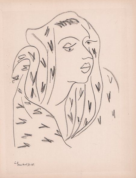 Colotipia su carta Arches, firmata e datata in basso a sinistra L 8 ' Henri Matisse 42. Una bella impressione, condizioni eccellenti. Henry Matisse nasce nel 1869 a Cateu Cambrésis. Inizia a dipingere durante la convalescenza per una malattia, scoprendo una grande passione per l'arte. Lascia così la facoltà di giurisprudenza per iscriversi nel 1891 all’Accademia Julian di Parigi. Viene ammesso nel 1992 all'?cole des Beaux-Arts, presso lo studio di Gustave Moreau dove si esercita nella copia di opere esposte al Louvre e dal vero. Rifiuta presto il conformismo delle accademie ed inizia una ricerca artistica personale frequentando lo studio di Carrière e studiando scultura sotto la guida di Barye e Rodin. Espone regolarmente al Salon des Indipendace e, a partire dal 1903 al Salon d’Automne, mentra la prima mostra personale risale al 1904 presso la galleria Vollard. Nel 1905 i lavori di Matisse e quelle dei suoi compagni esposte al Salon d’Automne vengono definite da un critico francese “fauves”, ovvero belve, per descrivere opere dai colori squillanti e dalle forme piatte. Grazie alla frequentazione del salotto di Gertrude Stein conosce Picasso e Alfred Stieglitz che porta Matisse ad esporre a New York. Dopo il 1907 si assiste ad una progressiva ricerca della semplificazione formale, mentre dopo il 1913 è evidente l'influenza dei suoi viaggi in Marocco. Nel 1917 Matisse si trasferisce a Nizza ed inizia a viaggiare con intensità tra gli Stati Uniti, l'Europa e la Polinesia. Il più importante progetto degli ultimi sarà la costruzione della Cappella dei Domenicani a Vence realizzata dal 1948 al 1951. Matisse muore a Nizza il 3 novembre del 1954. Colotype on arches vellum paper, signed and dated at lower left L ' 8 Henri Matisse 42. A fine impression, excellent codition. Henri Émile Benoît Matisse (31 December 1869 ' – ' 3 November 1954) was a French artist, known for both his use of colour and his fluid and original draughtsmanship. He was a draughtsman, printmaker, and sculptor, but is known primarily as a painter. Matisse is commonly regarded, along with Pablo Picasso, as one of the artists who best helped to define the revolutionary developments in the visual arts throughout the opening decades of the twentieth century, responsible for significant developments in painting and sculpture. The intense colorism of the works he painted between 1900 and 1905 brought him notoriety as one of the Fauves (wild beasts). Many of his finest works were created in the decade or so after 1906, when he developed a rigorous style that emphasized flattened forms and decorative pattern. In 1917, he relocated to a suburb of Nice on the French Riviera, and the more relaxed style of his work during the 1920s gained him critical acclaim as an upholder of the classical tradition in French painting. After 1930, he adopted a bolder simplification of form. When ill health in his final years prevented him from painting, he created an important body of work in the medium of cut paper collage. His mastery of the expressive language of colour and drawing, displayed in a body of work spanning over a half-century, won him recognition as a leading figure in modern art. Cfr.
