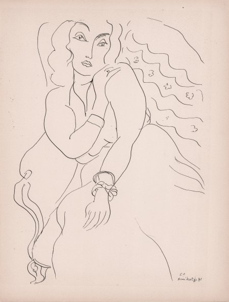 Colotipia su carta Arches, firmata e datata in basso a destra ' Henri Matisse 41. Una bella impressione, condizioni eccellenti. Henry Matisse nasce nel 1869 a Cateu Cambrésis. Inizia a dipingere durante la convalescenza per una malattia, scoprendo una grande passione per l'arte. Lascia così la facoltà di giurisprudenza per iscriversi nel 1891 all’Accademia Julian di Parigi. Viene ammesso nel 1992 all'?cole des Beaux-Arts, presso lo studio di Gustave Moreau dove si esercita nella copia di opere esposte al Louvre e dal vero. Rifiuta presto il conformismo delle accademie ed inizia una ricerca artistica personale frequentando lo studio di Carrière e studiando scultura sotto la guida di Barye e Rodin. Espone regolarmente al Salon des Indipendace e, a partire dal 1903 al Salon d’Automne, mentra la prima mostra personale risale al 1904 presso la galleria Vollard. Nel 1905 i lavori di Matisse e quelle dei suoi compagni esposte al Salon d’Automne vengono definite da un critico francese “fauves”, ovvero belve, per descrivere opere dai colori squillanti e dalle forme piatte. Grazie alla frequentazione del salotto di Gertrude Stein conosce Picasso e Alfred Stieglitz che porta Matisse ad esporre a New York. Dopo il 1907 si assiste ad una progressiva ricerca della semplificazione formale, mentre dopo il 1913 è evidente l'influenza dei suoi viaggi in Marocco. Nel 1917 Matisse si trasferisce a Nizza ed inizia a viaggiare con intensità tra gli Stati Uniti, l'Europa e la Polinesia. Il più importante progetto degli ultimi sarà la costruzione della Cappella dei Domenicani a Vence realizzata dal 1948 al 1951. Matisse muore a Nizza il 3 novembre del 1954. Colotype on arches vellum paper, signed and dated at lower right ' Henri Matisse 41. A fine impression, excellent codition. Henri Émile Benoît Matisse (31 December 1869 ' – ' 3 November 1954) was a French artist, known for both his use of colour and his fluid and original draughtsmanship. He was a draughtsman, printmaker, and sculptor, but is known primarily as a painter. Matisse is commonly regarded, along with Pablo Picasso, as one of the artists who best helped to define the revolutionary developments in the visual arts throughout the opening decades of the twentieth century, responsible for significant developments in painting and sculpture. The intense colorism of the works he painted between 1900 and 1905 brought him notoriety as one of the Fauves (wild beasts). Many of his finest works were created in the decade or so after 1906, when he developed a rigorous style that emphasized flattened forms and decorative pattern. In 1917, he relocated to a suburb of Nice on the French Riviera, and the more relaxed style of his work during the 1920s gained him critical acclaim as an upholder of the classical tradition in French painting. After 1930, he adopted a bolder simplification of form. When ill health in his final years prevented him from painting, he created an important body of work in the medium of cut paper collage. His mastery of the expressive language of colour and drawing, displayed in a body of work spanning over a half-century, won him recognition as a leading figure in modern art. Cfr.