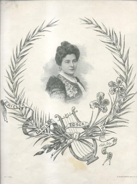 Cm.35,4x25. Con fregio decorativo di G.Rudel. Hariclea Darclée, nome d'arte di Hariclea Darclée, nome d'arte di Hariclea Haricli (Brăila, 10 giugno 1860 – Bucarest, 12 gennaio 1939), celebre soprano rumeno, fu la prima interprete di "Tosca" di Giacomo Puccini al Teatro Costanzi di Roma il 14 gennaio 1900. Codice libreria 111174.