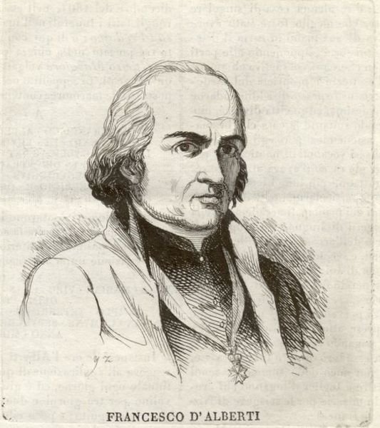 Ritratto inciso su rame di Francesco d'Alberti, conte di Villanuova. Tratto dal giornale "L'Album". Roma, 1860 circa.