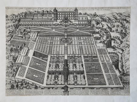 Acquaforte e bulino, firmata in basso a destra: «In Roma presso Claudio Duchetto lanno 1581». Parte dello Speculum Romanae Magnificentiae. Iscritto in alto: «RITRATTO NEL QVALE SI RAPPRESENTA IL VERO SITO DELL’HORTI, ET FONTANE CHE CON INGENIOSISSIMI ADORNAMENTI ET MARAVIGLIE SI VEDONO NELLA VILLA IN TIVOLI, FATTA DALLA FE[LICE] ME[MORIA]D’HIPPOLITO DA ESTE CARD[INALE] DI FERRARA» (in basso 35 didascalie numerate). Dopo aver lavorato al Casino di Pio IV (1559-1565) in Vaticano, Pirro Ligorio lavorò a Villa d’Este a Tivoli. Il contributo del Ligorio non risulta dai documenti, ma la sua carica di antiquario di Casa d’Este e le affinità della villa tiburtina con il Casino di Pio IV inducono ad attribuire al Ligorio la sistemazione della villa. I lavori durarono dal 1560 sino alla morte di Ippolito d’Este (1572). La prima versione, celebrativa del complesso della villa con i giardini, si deve ad Étienne Du Pérac, pubblicata l’8 aprile 1573. Il Du Pérac ebbe a disposizione i progetti di Pirro Ligorio per i giardini di Villa d’Este. Quella qui proposta è l’edizione incisa da Ambrogio Brambilla (attribuzione per motivi stilistici) per i tipi di Claude Duchet nel 1581. Sulla sommità del colle è disegnato il palazzo del cardinale. «Il pendio con la terrazza si configura come un grande disegno ornamentale composto di motivi a losanga, e le varie fontane, che sono il vanto della villa, sono incastonate nella geometria dei giardini. A un primo sguardo, il visitatore percorrendo i sentieri, doveva percepire l’impressione di ordine geometrico, i sentieri conducevano alle grotte, contenenti scene di argomento mitologico, dinastico, eroico. Gli antichi torsi della collezione estense erano stati restaurati, cioè adattati a questo programma, e collocati nelle grotte. L’esempio meglio conosciuto di architettura programmatica è la cosiddetta Rometta, che compare nell’angolo in alto a destra dell’incisione […]. Si tratta della rappresentazione di un’antica Roma, con un Tevere in miniatura che scorre intorno ad un’isola. Alla figura di Roma, seduta su un trono al centro di un gruppo di rovine, corrisponde la grande figura seduta della Sibilla Tiburtina nella “fontana di Tivoli”; nella “fontana dell’Aniene” si trova a sua volta la figura reclinata del vicino fiume Aniene, dal quale proviene l’acqua per l’intera villa» (W.Lotz). Oltre l’edizione del Du Pérac e del Duchet (1581) è nota la versione di Mario Cartaro per il Giubileo del 1575 (cfr. Marigliani, n. VI.18). La replica pubblicata da Duchetti viene realizzata poiché nella divisione ereditaria dei rami Lafreri, la matrice della Villa d'Este spettò a Stefano Duchetti (cfr. V. Pagani, 2008a, p. 15, r. 82, inventario del 1581b, dove figura il “Giardino di Tiuoli di fol. Imp.lj”. L’opera appartiene allo ' Speculum Romanae Magnificentiae, la prima iconografia della Roma antica. ' Lo ' Speculum ' ebbe origine nelle attività editoriali di Antonio Salamanca e Antonio Lafreri (Lafrery). Durante la loro carriera editoriale romana, i due editori - che hanno lavorato insieme tra il 1553 e il 1563 - hanno avviato la produzione di stampe di architettura, statuaria e vedutistica della città legate alla Roma antica e moderna. Le stampe potevano essere acquistate individualmente da turisti e collezionisti, ma venivano anche acquistate in gruppi più grandi che erano spesso legati insieme in un album. Nel 1573, Lafreri commissionò a questo scopo un frontespizio, dove compare per la prima volta il titolo Speculum Romanae Magnificentiae. Alla morte di Lafreri, due terzi delle lastre di rame esistenti andarono alla famiglia Duchetti (Claudio e Stefano), mentre un altro terzo fu distribuito tra diversi editori. Claudio Duchetti continuò l’attività editoriale, implementando le lastre dello Speculum con copie di quelle “perdute” nella divisione ereditaria, che fece incidere al milanese Amborgio Brambilla. Alla morte di Claudio (1. Etching and engraving, signed and dated at bottom right: “In Roma apresso Chlaudio Duchetto lanno 1581”. Part of Speculum Romanae Magnificentiae. Inscribed at the top: “PORTRAIT IN THE QVALE IS REPRESENTING THE TRUE SITE OF THE HORTI, ET FONTANE WHICH WITH INGENIOSISIMOUS ADORNAMENTS AND MARAVIGLIE IS VILLA IN TIVOLI, DONE BY FE[LICE] ME[MORIA]D'HIPPOLITO DA ESTE CARD[INALE] DI FERRARA” (below 35 numbered captions). After working at the Casino of Pius IV (1559-1565) in the Vatican, Pirro Ligorio worked at Villa d'Este in Tivoli. Ligorio's contribution does not appear in the documents, but his position as antiquarian of Casa d'Este and the affinities of the Tiburtine villa with the Casino of Pius IV lead to attribute the arrangement of the villa to Ligorio. The works lasted from 1560 until the death of Ippolito d'Este (1572). The first version, celebrating the complex of the villa with its gardens, is due to Étienne Du Pérac, published on April 8, 1573. The Du Pérac had at his disposal the plans of Pirro Ligorio for the gardens of Villa d'Este. The one proposed here is the edition engraved by Ambrogio Brambilla (attribution for stylistic reasons) for the publisher Claude Duchet in 1581. On the top of the hill is drawn the cardinal's palace. In addition to the edition of the Du Pérac and the Duchet (1581) is known the version of Mario Cartaro for the Jubilee of 1575 (see Marigliani, n. VI.18). The replica published by Duchetti is realized because in the hereditary division of the Lafreri’s workshop, the copperplate of the Villa d'Este belonged to Stefano Duchetti (cf. V. Pagani, 2008a, p. 15, r. 82, inventory 1581b), where is listed the “Giardino di Tiuoli di fol. Imp.lj”. The work belongs to the Speculum Romanae Magnificentiae, the earliest iconography of ancient Rome. ' The Speculum originated in the publishing activities of Antonio Salamanca and Antonio Lafreri (Lafrery). During their Roman publishing careers, the two editors-who worked together betwee