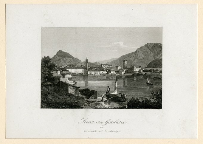 Incisione in acciaio di dimensioni 73x102 mm. Condizioni : USATO - Stato : Buono. Altre note : Veduta di Riva del Garda. Per impostazione è molto simile a una delle vedute del Trentino realizzate da Basilio Armani, con i pescatori in primo piano a lavoro attorno al barcone e i ruderi sulla sx. Scheda bibliografica tratta da "Il Garda nelle stampe" a cura di Ugo Spini, scheda n. 191 pag. 102. Disponibile altra copia refilata per 100 euro.