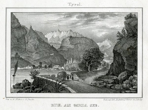 Litografia di dimensioni 98x154 mm. Piccola macchia nell'angolo inferiore dx. Condizioni : USATO - Stato : Buono, ordinari segni d'uso e del tempo. Altre note : Veduta di Riva del Garda colta dalla strada che porta a Torbole, privilegiando la cupa impressione delle montagne che incombono sul paese. Come si legge nella parte inferiore, il disegno dal vero è di Georg Pezolt e l'incisione di Joseph Oberer. Scheda bibliografica tratta da "Trento illustrata: la città e il territorio in piante e vedute dal XVI al XX secolo" di Aldo Chemelli e Carlo e Marcus Perini, scheda n. 78.