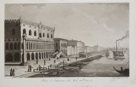 Stampa tratta da ' Viaggi in Italia per Francesco Gandini, overo descrizione Geografica, Storica, Pittorica, Statistica Postale e Commerciale dell'Italia, edito a Cremona dal 1830 al 1836. Affascinante opera in otto volumi (nove tomi) riguardanti: Quadro generale dell'Italia, Stati di Sardegna, Governo di Milano, Governo di Venezia, Ducati di Parma Piacenza Massa etc., Gran Ducato di Toscana, Stato della Chiesa, Regno di Napoli e Isole dell'Italia. Numerose sono le tavole fuori testo, incise all'acquatinta da Landini, raffiguranti vedute di città italiane. ' Incisione in rame all'acquatinta, in ottimo stato di conservazione. Plate ' taken from ' Viaggi in Italia per Francesco Gandini, overo descrizione Geografica, Storica, Pittorica, Statistica Postale e Commerciale dell'Italia, published in Cremona from 1830 to 1836. Fascinating work in eight volumes (nine tomes) about: General framework of Italy, States of Sardinia, Government of Milan, Government of Venice, Duchies of Parma Piacenza Massa etc., Grand Duchy of Tuscany, State of the Church, Kingdom of Naples and Islands of Italy. There are numerous plates outside the text, etched in aquatint by Landini, depicting views of Italian cities. ' Copperplate, in excellent condition. Cfr.