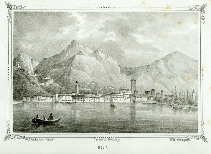Litografia di dimensioni 11x16,5 cm. Condizioni : USATO - Stato : Buono, ordinari segni d'uso e del tempo. Lievissimi segni di foxing. Altre note : Veduta di Riva del Garda, con singolare punto di vista frontale che si scosta dalle più comuni rappresentazioni della cittadina, la quale viene in genere mostrata chiusa fra i monti circostanti. In primo piano barcone. Il disegno dal vero è del Calderari, Moro è incisore. Sta in "Viaggio da Desenzano a Trento" di Ignazio Puecher Passavalli e Giovanni Prati. Scheda bibliografica tratta da "Il Garda nelle stampe" a cura di Ugo Spini, scheda n. 217 p. 113.