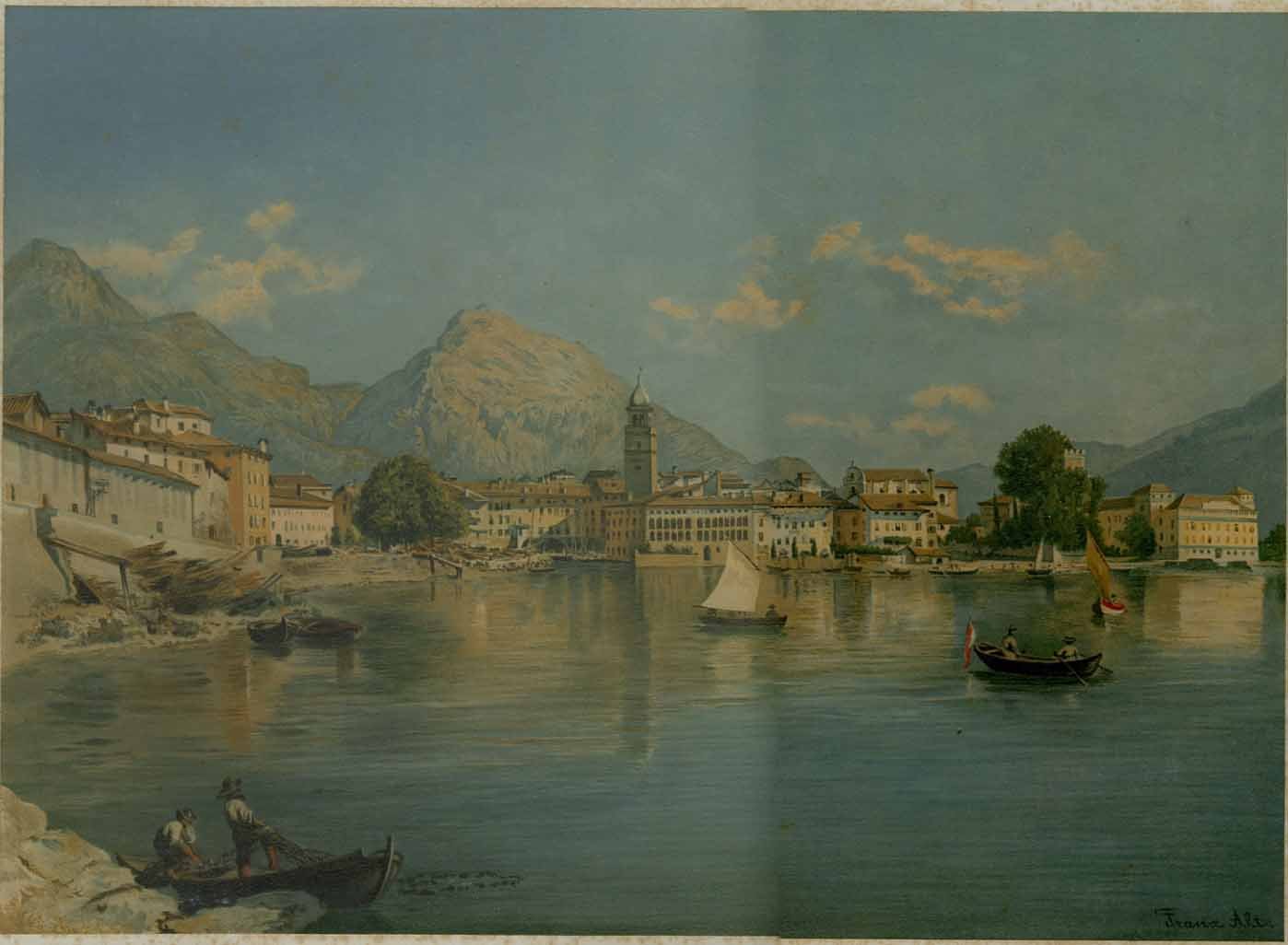 Litografia a colori di dimensioni 263x377 mm. Condizioni : USATO - Stato : Buono, ordinari segni d'uso e del tempo. Lievissimi segni di foxing. Altre note : Veduta di Riva del Garda ad opera di Franz Alt, allievo e figlio di Jacob, fratello di Rudolf. Scheda bibliografica tratta da "Il Garda nelle stampe" a cura di Ugo Spini, scheda n. 296 a pag. 140. Fu realizzata probabilmente durante un suo viaggio di studio nel Tirolo ed usualmente è contenuta nell'opera dal titolo "Aus den Alpen". Si vende in cornice.