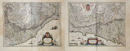 Coppia di carte geografiche della Liguria inserita nell'Atlas Major ' del Blaeu.Dal punto di vista cartografico le mappe derivano dalle carte di Giovanni Antonio Magini, già riprese in Olanda da Jodocus Hondius. Willem Janszoon Blaeu, avviò nel 1599 la sua attività di costruttore di globi e strumenti astronomici ad Amsterdam. Nel 1630, dopo aver comprato alcune lastre dell’atlante del Mercator da Jodocus Hondius II, fu in grado di pubblicare un volume di 60 mappe con il titolo di ' Atlantis Appendix. Cinque anni dopo, pubblicò i primi due volumi del suo atlante ' Atlas Novus ' o ' Theatrum Orbis Terrarum, ' in sei libri. Dopo la sua morte, Joan (Johannes) continuò l’opera paterna, completando l’intera serie di sei volume dell’Atlas Novus ' intorno al 1655. Fu inoltre autore di un ' Atlas Maior sive Cosmographia Blaviana, in 12 volumi pubblicati nel 1662 -72, dei quali uno dedicato all'Italia. La carta compare per la prima volta nel terzo volume del ' Theatrum. ' Secondo Koeman viene pubblicata in primis nell'edizione francese del 1640, dal titolo ' Le Theatre du Monde ou Nouvel Atlas, ' Mis en lumiere par Guillaume & Jean Blaeu. ' Troisieme partie. A Amsterdam, Chez Iean & Corneille Blaeu MDCXL. Il terzo volume del ' Theatrum ' contiene 58 carte dell'Italia e 4 della Grecia (cfr. Koeman, ' Atlas Neerlandici, pp. 160-162, Bl 35A). Le carte dell'italia derivano tutte dall'opera di Giovanni Antonio Magini. Tuttavia, sembra più probabile che il Blaeu si basi sue quelle di Hendrick Hondius e Johannes Janssonius pubblicate nel ' Theatrum Italiae in quo Eius Regna, Domina, Ducatus, Et Speciatim Illorum Provinciae, Tabulis Accuratissimis, Iam, De Novo in Lucem Editio, Describunter, Quorum Sequens Pagina Indicabit, stampato ad Amsterdam da Hendrick Hondius nel 1636. ' Sebbene pubblicate dopo la morte di Willem Janszoon Blaeu (1638) le carte spesso recano il suo imprint. Non è dato sapere se fossero tutte già pronte o se i figli Johannes e Cornelis le compilarono postume. Incisione in rame, magnifica coloritura coeva, in ottimo stato di conservazione. Striking example of Blaeu's decorative maps of Liguria, after Giovanni Antonio Magini. Willem Janszoon Blaeu, started in 1599 his business as a builder of globes and astronomical instruments in Amsterdam. In 1630, after buying some plates of the Mercator atlas from Jodocus Hondius II, he was able to publish a volume of 60 maps under the title ' Atlantis Appendix. Five years later, he published the first two volumes of his atlas ' Atlas Novus ' or ' Theatrum Orbis Terrarum, in six books. After his death, Joan (Johannes) continued his father's work, completing the entire six-volume ' Atlas Novus ' series around 1655. He was also the author of an ' Atlas Maior sive Cosmographia Blaviana, in 12 volumes published in 1662 -72, one of which was devoted to Italy. The map first appears in the third volume of the ' Theatrum. According to Koeman it is first published in the French edition of 1640, entitled ' Le Theatre du Monde ou Nouvel Atlas, Mis en lumiere par Guillaume & Jean Blaeu. Troisieme partie. In Amsterdam, Chez Iean & Corneille Blaeu MDCXL. The third volume of the ' Theatrum ' contains 58 maps of Italy and 4 of Greece (see Koeman, ' Atlas Neerlandici, pp. 160-162, Bl 35A). The maps of Italy are all derived from the work of Giovanni Antonio Magini. However, it seems more likely that Blaeu relies on those of Hendrick Hondius and Johannes Janssonius published in ' Theatrum Italiae in quo Eius Regna, Domina, Ducatus, Et Speciatim Illorum Provinciae, Tabulis Accuratissimis, Iam, De Novo in Lucem Editio, Describunter, Quorum Sequens Pagina Indicabit, ' printed in Amsterdam by Hendrick Hondius in 1636. Although published after the death of Willem Janszoon Blaeu (1638) the maps often bear his imprint. It is not known whether they were all ready-made or if his sons Johannes and Cornelis completed them posthumously. Copperplate, with fine original colouring, in very good conditions. Cfr.