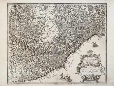 Carta geografica tratta dal ' L’Italia ' a cura di Fabio Magini, edito a Bologna nel 1620, tre anni dopo la prematura morte del padre. Composto da un breve testo descrittivo di sole 24 carte, l’opera è corredata di 61 carte geografiche della penisola, e costituisce il primo esempio di atlante italiano. L’opera è per intero di mano del Magini, che iniziò la realizzazione delle carte nel 1594 circa, dando alla luce per prima nel 1595 la carta del territorio di Bologna. Tutte le carte vennero alle stampe quindi prima del 1620, nelle loro stesure provvisorie, successivamente corrette ed aggiornate per l’edizione definitiva. Per la realizzazione delle lastre il Magini si servì di due dei più famosi intagliatori dell’epoca: il belga Arnoldo Arnoldi e l’inglese Benjamin Wright. Una prima stesura delle carte della Liguria viene realizzata dal Magini nel 1597, basandosi su un disegno fornitogli dal prete Orazio Bracelli e su informazioni ricevute dal Duca Gonzaga. ' Completamente ignorate, apparentemente, le carte a stampa realizzate precedentemente. La stesura definitiva avviene nel 1609, elaborando il manoscritto del Bracelli con altri disegni fornitogli da due gentiluomo genovesi non meglio noti. Ignorata, anche in questo caso, fu la carta di J.B. Vrients, edita nel 1608 nel ' Theatrum Orbis Terrarum ' di Ortelius, prima carta a stampa della sola Liguria. ' Le carte vennero alla luce nel 1609, ad opera del Wright. Le due carte separate delle Riviere costituiscono una novità assoluta, modello per tutti i cartografi successivi. Incisione in rame, in perfetto stato di conservazione. Scrive Roberto Almagià nel suo saggio sull'opera maginiana del 1922: "Le carte del Piemonte e della Liguria in generale debbono essere considerate insieme, perché riposano di materiali comuni. […] per tali carte il Magini ebbe i materiali ed eseguì il lavoro in due epoche diverse ed assai lontane: una prima volta nel 1597 (e forse in parte ancora l'anno prima) e una seconda volta, oltre dieci anni dopo, nel 1608-9. Come risulta anche dall'elenco del 1604, la prima volta egli mise insieme due carte delle due Riviere e tre carte del Piemonte; la seconda volta rifece le due carte della Liguria, sostituendole alle vecchie, e fece una nuova carta del Piemonte. […] le due tavole della Liguria della più vecchia redazione, che il Magini ha eliminato dall'Atlante, ci sono tuttavia rimaste, ed, essendo finora sfuggite alla attenzione degli studiosi […] La vecchia "Riviera di Genova di Occidentale ha la dedica di G. A. Magini ad Orazio Bracelli in data 15 ottobre 1597"; la vecchia "Riviera di Genova di Levante" non ha dedica né data. Entrambe sono pure di mano dell'Arnoldi, e la prima è anzi una continuazione verso sud dello "Stato del Piemonte". […] Anteriormente all'anno 1597, che si può ritenere come data di redazione di questo gruppo di carte, esistevano già parecchie carte a stampa del Piemonte, taluna delle quali comprendenti anche parte della Liguria; nessna carta, né a stampa né manoscritta, è a me comoscuta delle Riviere, epperò le due carte maginiane dovrebbero essere le più antiche conosciute". ' Bibliografia Almagià, L'Italia di Giovanni Antonio Magini e la Cartografia dell'Italia nei secolo XVI e XVII (1922), pp. 23-29. Map taken from ' L'Italia ' edited by Fabio Magini, published in Bologna in 1620, three years after the untimely death of his father. Composed of a short descriptive text of only 24 pages, the work is accompanied by 61 maps of the peninsula, and is the first example of an Italian atlas. The work is entirely by the hand of Giovanni Antonio Magini, who began the realization of the maps in 1594 or so; the first dated map (1595) the map of the territory of Bologna. All the maps were printed before 1620, in their provisional drafts, later corrected and updated for the final edition. For the realization of the plates Magini used two of the most famous engravers of the time: the Belgian Arnoldo Arnoldi and the English Benjamin Wright. Copperplate, in good condition. Scrive Roberto Almagià nel suo saggio sull'opera maginiana del 1922: "Le carte del Piemonte e della Liguria in generale debbono essere considerate insieme, perché riposano di materiali comuni. […] per tali carte il Magini ebbe i materiali ed eseguì il lavoro in due epoche diverse ed assai lontane: una prima volta nel 1597 (e forse in parte ancora l'anno prima) e una seconda volta, oltre dieci anni dopo, nel 1608-9. Come risulta anche dall'elenco del 1604, la prima volta egli mise insieme due carte delle due Riviere e tre carte del Piemonte; la seconda volta rifece le due carte della Liguria, sostituendole alle vecchie, e fece una nuova carta del Piemonte. […] le due tavole della Liguria della più vecchia redazione, che il Magini ha eliminato dall'Atlante, ci sono tuttavia rimaste, ed, essendo finora sfuggite alla attenzione degli studiosi […] La vecchia "Riviera di Genova di Occidentale ha la dedica di G. A. Magini ad Orazio Bracelli in data 15 ottobre 1597"; la vecchia "Riviera di Genova di Levante" non ha dedica né data. Entrambe sono pure di mano dell'Arnoldi, e la prima è anzi una continuazione verso sud dello "Stato del Piemonte". […] Anteriormente all'anno 1597, che si può ritenere come data di redazione di questo gruppo di carte, esistevano già parecchie carte a stampa del Piemonte, taluna delle quali comprendenti anche parte della Liguria; nessna carta, né a stampa né manoscritta, è a me comoscuta delle Riviere, epperò le due carte maginiane dovrebbero essere le più antiche conosciute". ' Bibliografia Almagià, L'Italia di Giovanni Antonio Magini e la Cartografia dell'Italia nei secolo XVI e XVII (1922), pp. 23-29. Cfr.