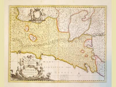 Incisione in rame, coloritura originale d'epoca, mm 380x490. Non comune, decorativa carta, arricchita da due elaborati cartigli. Piacevole carta del territorio, il quale comprende i territori compresi tra Genova e La Spezia. Schenk e Valk fondarono una società editoriale che pubblicò lastre acquistate da editori precedenti. Ottimo esemplare marginoso.<BR>
