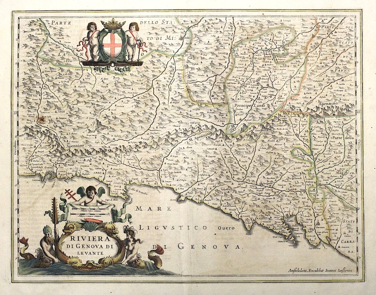 Incisione in rame, colorata a mano, mm 380x495. Fascinosa carta con due ricchi cartigli ai due angoli destri. Janssonius fu in collaborazione con il cognato Henricus Hondius, il più importante concorrente dei Blaeu a cui ispirò ed uniformò la produzione, tanto da costringere Blaeu, anch'egli Jansson di cognome, a scegliere il suo famoso pseudonimo per differenziare la propria produzione. Buon esemplare, molto marginoso.