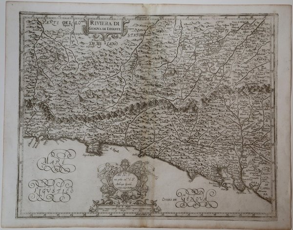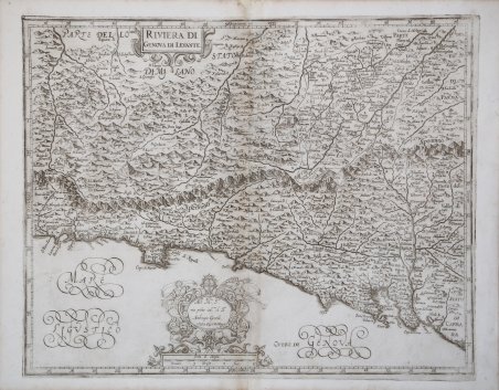 Carta geografica tratta dal ' L’Italia ' a cura di Fabio Magini, edito a Bologna nel 1620, tre anni dopo la prematura morte del padre. Composto da un breve testo descrittivo di sole 24 carte, l’opera è corredata di 61 carte geografiche della penisola, e costituisce il primo esempio di atlante italiano. L’opera è per intero di mano del Magini, che iniziò la realizzazione delle carte nel 1594 circa, dando alla luce per prima nel 1595 la carta del territorio di Bologna. Tutte le carte vennero alle stampe quindi prima del 1620, nelle loro stesure provvisorie, successivamente corrette ed aggiornate per l’edizione definitiva. Per la realizzazione delle lastre il Magini si servì di due dei più famosi intagliatori dell’epoca: il belga Arnoldo Arnoldi e l’inglese Benjamin Wright. Una prima stesura delle carte della Liguria viene realizzata dal Magini nel 1597, basandosi su un disegno fornitogli dal prete Orazio Bracelli e su informazioni ricevute dal Duca Gonzaga. ' Completamente ignorate, apparentemente, le carte a stampa realizzate precedentemente. La stesura definitiva avviene nel 1609, elaborando il manoscritto del Bracelli con altri disegni fornitogli da due gentiluomo genovesi non meglio noti. Ignorata, anche in questo caso, fu la carta di J.B. Vrients, edita nel 1608 nel Theatrum Orbis Terrarum di Ortelius, prima carta a stampa della sola Liguria. ' Le carte vennero alla luce nel 1609, ad opera del Wright. Le due carte separate delle Riviere costituiscono una novità assoluta, modello per tutti i cartografi successivi. Incisione in rame, in perfetto stato di conservazione. Scrive Roberto Almagià nel suo saggio sull'opera maginiana del 1922: "Le carte del Piemonte e della Liguria in generale debbono essere considerate insieme, perché riposano di materiali comuni. […] per tali carte il Magini ebbe i materiali ed eseguì il lavoro in due epoche diverse ed assai lontane: una prima volta nel 1597 (e forse in parte ancora l'anno prima) e una seconda volta, oltre dieci anni dopo, nel 1608-9. Come risulta anche dall'elenco del 1604, la prima volta egli mise insieme due carte delle due Riviere e tre carte del Piemonte; la seconda volta rifece le due carte della Liguria, sostituendole alle vecchie, e fece una nuova carta del Piemonte. […] le due tavole della Liguria della più vecchia redazione, che il Magini ha eliminato dall'Atlante, ci sono tuttavia rimaste, ed, essendo finora sfuggite alla attenzione degli studiosi […] La vecchia "Riviera di Genova di Occidentale ha la dedica di G. A. Magini ad Orazio Bracelli in data 15 ottobre 1597"; la vecchia "Riviera di Genova di Levante" non ha dedica né data. Entrambe sono pure di mano dell'Arnoldi, e la prima è anzi una continuazione verso sud dello "Stato del Piemonte". […] Anteriormente all'anno 1597, che si può ritenere come data di redazione di questo gruppo di carte, esistevano già parecchie carte a stampa del Piemonte, taluna delle quali comprendenti anche parte della Liguria; nessna carta, né a stampa né manoscritta, è a me comoscuta delle Riviere, epperò le due carte maginiane dovrebbero essere le più antiche conosciute". ' Bibliografia Almagià, L'Italia di Giovanni Antonio Magini e la Cartografia dell'Italia nei secolo XVI e XVII (1922), pp. 23-29. Map taken from ' L'Italia ' edited by Fabio Magini, published in Bologna in 1620, three years after the untimely death of his father. Composed of a short descriptive text of only 24 pages, the work is accompanied by 61 maps of the peninsula, and is the first example of an Italian atlas. The work is entirely by the hand of Giovanni Antonio Magini, who began the realization of the maps in 1594 or so; the first dated map (1595) the map of the territory of Bologna. All the maps were printed before 1620, in their provisional drafts, later corrected and updated for the final edition. For the realization of the plates Magini used two of the most famous engravers of the time: the Belgian Arnoldo Arnoldi and the English Benjamin Wright. Copperplate, in good condition. Scrive Roberto Almagià nel suo saggio sull'opera maginiana del 1922: "Le carte del Piemonte e della Liguria in generale debbono essere considerate insieme, perché riposano di materiali comuni. […] per tali carte il Magini ebbe i materiali ed eseguì il lavoro in due epoche diverse ed assai lontane: una prima volta nel 1597 (e forse in parte ancora l'anno prima) e una seconda volta, oltre dieci anni dopo, nel 1608-9. Come risulta anche dall'elenco del 1604, la prima volta egli mise insieme due carte delle due Riviere e tre carte del Piemonte; la seconda volta rifece le due carte della Liguria, sostituendole alle vecchie, e fece una nuova carta del Piemonte. […] le due tavole della Liguria della più vecchia redazione, che il Magini ha eliminato dall'Atlante, ci sono tuttavia rimaste, ed, essendo finora sfuggite alla attenzione degli studiosi […] La vecchia "Riviera di Genova di Occidentale ha la dedica di G. A. Magini ad Orazio Bracelli in data 15 ottobre 1597"; la vecchia "Riviera di Genova di Levante" non ha dedica né data. Entrambe sono pure di mano dell'Arnoldi, e la prima è anzi una continuazione verso sud dello "Stato del Piemonte". […] Anteriormente all'anno 1597, che si può ritenere come data di redazione di questo gruppo di carte, esistevano già parecchie carte a stampa del Piemonte, taluna delle quali comprendenti anche parte della Liguria; nessna carta, né a stampa né manoscritta, è a me comoscuta delle Riviere, epperò le due carte maginiane dovrebbero essere le più antiche conosciute". ' Bibliografia Almagià, L'Italia di Giovanni Antonio Magini e la Cartografia dell'Italia nei secolo XVI e XVII (1922), pp. 23-29. Cfr.