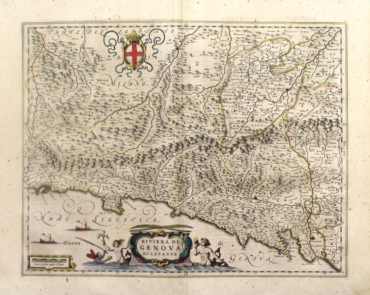 Incisione in rame, mm 385x510, testo latino al verso. Elegante e piacevole carta del Levante ligure, arricchita da cartigli, navi e stemmi. Ottimo esemplare perfettamente conservata anche se lievemente ingiallita. W. Blaeu, astronomo allievo di Tycho Brahe, fondò un'officina per la costruzione di globi nel 1599; quasi immediatamente iniziò a pubblicare anche carte geografiche, giungendo nel 1630 alla creazione del primo atlante "Atlantis Appendix" e cinque anni dopo, della prima edizione in due tomi del "Atlas Novus". Dopo la sua morte nel 1638, a cura del figlio Johan si giunse nel 1662 alla pubblicazione del celebre "Atlas Maior" in 11 volumi. Nel 1672 un incendio distrusse l'officina e segnò la fine dell'attività. <BR>Copper engraving, mm 385x510, latin text on verso. Elegant map of the Levante ligure between Genova and Sarzana. Good condition even if slightly discolored. W. Blaeu, born in Alkmaar in 1571, studied astronomy by Tycho Brahe and founded a business in 1599 as a globe and instrument maker. He immediately expanded the business publishing maps and in 1630 the first atlas "Atlantis appendix" and five years later the "Atlas novus". After his death in 1638, his son Joan reached publication of the major work of the family, the "Atlas maior" in 11 volumes. In 1672 a great fire destroyed the Blaeu's printing house. <BR>