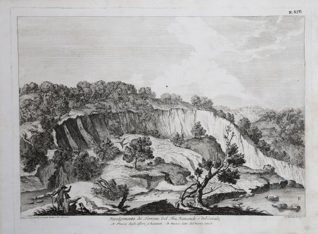 Veduta tratta dal celebre ' Istoria de' fenomeni del tremoto avvenuto nelle Calabrie, e nel Valdemone nell'anno 1783. Posta in luce dalla Reale Accademia delle Scienze, e delle Belle Lettere di Napoli. Napoli, Giuseppe Campo, 1784. Le incisioni dell'Istoria de' fenomeni ' illustrano il rovinoso terremoto calabrese del 1783 e furono commissionate dalla Regia Accademia Napoletana a un gruppo di scienziati, tra cui Michele Sarconi, Angiolo Fasano, Nicolò Pacifico, Padre Eliseo della Concezione e Antonio Minasi, oltre agli architetti e disegnatori Pompeo Schiantarelli, Ignazio Stile e Bernardino Rulli. La spedizione partì da Napoli il 5 aprile 1783 e nel 1784 il resoconto delle sue scoperte fu pubblicato da Campo, rendendola la prima spedizione scientifica sulle conseguenze di un terremoto mai organizzata in Italia. Il terremoto scosse la Calabria e la parte orientale della Sicilia per più di tre anni con diverse scosse, tra cui 5 che registrarono il grado XI della scala Mercalli. Morirono più di 30.000 persone, centinaia di villaggi furono distrutti, le montagne crollarono, i fiumi cambiarono il loro corso creando nuovi laghi e anche le coste furono rimodellate. L'autore dell'Istoria ' è il segretario dell'Accademia, Michele Sarconi. L’Atlante consiste in una raccolta di 68 tavole eseguite dagli architetti Pompeo Schiantarelli ed Ignazio Stile, tutti incisi da Antonio Zaballi, di una grande Carta corografica della Calabria ulteriore, ripiegata più volte, opera di P. Eliseo, e di un disegno raffigurante una «macchina equatoriale». Il progetto di tale opera, unica del suo genere, nasce in seno all’Accademia Napoletana, che istituisce ‘una peregrinazione letteraria nei luoghi della Calabria Ultra e del Valdemone, i quali erano stati i più potentemente della natura ne’ fatal’istanti del suo furore oltraggiati’. La partenza della spedizione degli Accademici Napoletani avviene via mare da Napoli il 5 aprile 1783, un paio di mesi dopo la prima scossa. Il drappello abbastanza nutrito è composto dal segretario dell’Accademia Michele Sarconi, dagli accademici pensionari Angiolo Fasano, Nicolò Pacifico, P. Eliseo della Concezione Teresiano e P. Antonio Minasi Domenicano, dai soci D. Giulio Candida, D. Giuseppe Stefanelli, D. Luigi Sebastiani, dagli architetti addetti ai disegni, Pompeo Schiantarelli con l’incarico di direttore, D. Ignazio Stile e D. Bernardino Rulli. Nella suddivisione dei compiti, il segretario Sarconi prende con sé il disegnatore D. Pompeo Schiantarelli, mentre Pacifico, Fasano e Sebastiani si fanno seguire da D. Ignazio Stile. D. Bernardino Rulli viene aggregato a P. Eliseo e a P. Minasi. Incisione in rame, stampata su carta vergata coeva, minimi aloni di umidità e ossidazioni, per il resto in ' ottimo stato di conservazione. View taken from the ' ' Istoria de' fenomeni del tremoto avvenuto nelle Calabrie, e nel Valdemone nell'anno 1783. Posta in luce dalla Reale Accademia delle Scienze, e delle Belle Lettere di Napoli. Naples: Giuseppe Campo, 1784. The engravings of the ' Istoria de' fenomeni ' illustrate the ruinous Calabrian earthquake of 1783 and were commissioned by the Neapolitan Royal Acadamy to a group of scientists, including Sarconi himself, Angiolo Fasano, Nicolò Pacifico, Padre Eliseo della Concezione and Antonio Minasi, as well as the architects and draughtsmen Pompeo Schiantarelli, Ignazio Stile and Bernardino Rulli. The expedition left Naples on 5th April 1783, and in 1784 the account of their findings was published by Campo, making it the first scientific expedition on the consequences of an earthquake ever to be organised in Italy. The earthquake shook Calabria and the eastern part of Sicily for more than three years with several tremors, including 5 which registered grade XI on Mercalli's scale. More than 30,000 people died, hundreds of villages were destroyed, mountains collapsed, rivers changed their course creating new lakes, and even the coastline was reshaped. Copperplate, printed o contemporary laid paper, ' minimal humidity and oxidation marks, otherwise in excellent condition. Cfr.