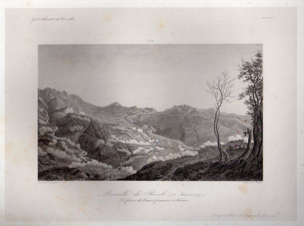 RIVOLI VERONESE – “Bataille de Rivoli(12 Janvier 1797). Defense de l’armée francaise à Ferrara.” Peint par Bagetti – Gravé par Skelton. Bella veduta panormamica con i fumi della battaglia in corso.