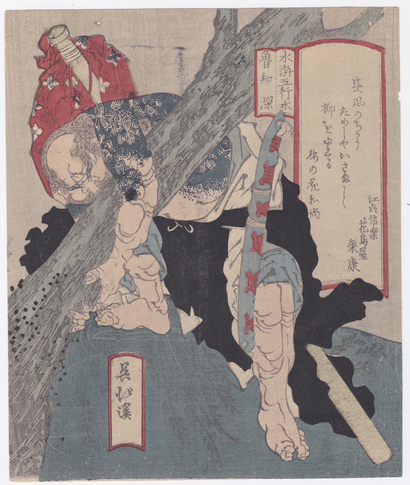 Dalla serie: Suiko Gogyo, dedicata agli eroi del romanzo cinese 108 eroi del Suikoden in relazione ai cinque elementi Gogyo. Nella composizione è rappresentato il guerriero cinese Lu Zhishen mentre sradica un salice per dimostrare la sua forza. Legni rifatti, impressione databile al periodo Meiji (1868-1912).