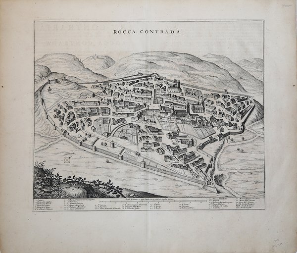 Opera tratta dalla rara prima edizione del Theatrum Civitatum et Admirandorum Italiae ad aevi veteris & praesentis temporis faciem expressum à Ioanne Blaeu G. F., stampata ad Amsterdam nel 1663. Si tratta del primo, monumentale, libro interamente dedicato alla cartografia urbana della sola penisola, preceduto dal “tascabile” ' Italia Hodierna ' di Jodocus Hondius del 1627 e realizzato in probabile concorrenza con Johannes Janssonius che, nel 1657, aveva pubblicato il ' Theatrum praecipuarum urbium, contenente un volume dedicato all’Italia. Johannes Blaeu, durante la sua lunga attività editoriale pubblica tre volumi sulle città italiane. Nel 1663 i primi tre, suddivisi in Stato della Chiesa, Roma e Regno di Napoli e Sicilia. Alla sua morte i suoi eredi danno alla luce altri due volumi datati 1682 incentrati sulle città del Piemonte e della Savoia, poi ristampati da altri editori nel 1693 e 1697. Il francese Pierre Mortier pubblica una ristampa nel 1704/5, intitolata ' Nouveau Theatre de l’Italie. ' L’opera è in quattro volumi e comprende le lastre del Blaeu, ritoccate e modificate in piccola parte, integrate dall’aggiunta di numerose nuove mappe di proprio disegno, raffiguranti le città della parte settentrionale della penisola, racchiuse nel primo volume dell’opera. L’atlante del Mortier venne pubblicato con testo latino, francese ed olandese. Il grande successo dell’opera diede origine ad un’ulteriore ristampa, praticamente identica, curata da Alberts ed edita nel 1724/5. Esemplare con testo descrittivo la verso, della prima edizione del 1663. Bibliografia Koeman, ' Atlas Neerlandici, pp. 332/338; Cremonini pp. 49-52, 39. Map taken form the rare first edition of Theatrum Civitatum et Admirandorum Italiae ad aevi veteris & praesentis temporis faciem expressum à Ioanne Blaeu G. F., printed by Johannes Blaeu, Amsterdam, 1663. This is the first monumental town book entirely covering Italy, preceded by the "pocket-size" ' Italia Hodierna ' by Jodocus Hondius jr. (1627) and realized in likely competition with Johannes Janssonius who, in 1657, published the ' Theatrum praecipuarum urbium, ' containing a volume dedicated to Italy. Johannes Blaeu, during his long editorial activity published three volumes on Italian cities. In 1663 the first three, divided into the State of the Church, Rome and the Kingdom of Naples and Sicily. At his death his heirs gave birth to two more volumes dated 1682 focused on the cities of Piedmont and Savoy, then reprinted by other publishers in 1693 and 1697. Pierre Mortier publishes a reprint in 1704/5, entitled ' Nouveau Theatre de l'Italie. The work is in four volumes and includes the plates of Blaeu, retouched and modified in small part, supplemented by the addition of several new maps of his own design, depicting the cities of the northern part of the peninsula, enclosed in the first volume of the work. Mortier's atlas was published with Latin, French and Dutch texts. The great success of the work gave rise to a further reprint, virtually identical, edited by R. Alberts and published in 1724/5. Example of the first edition, showing descriptive text on the back of the map. Literature Koeman, ' Atlas Neerlandici, pp. 332/338; Cremonini pp. 49-52, 39. Cfr.