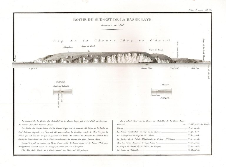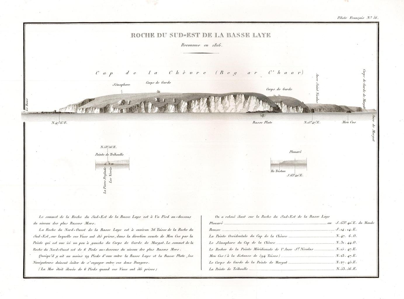 Incisione, antica ed originale, raffigurante le coste del nord-ovest della Francia nel litorale della Bretagna nei pressi di Brest in particolare: Cap de la Chèvre. Inserita nell’opera di Beautemps Beaupré Charles François (considerato il padre della idrografia moderna) “Pilote français, (environs de Brest) / Rédigé / Par M. Beautemps Beaupré Ingénieur Hydrographe en Chef de la Marine, / Membre de l’Académie Royale des Sciences de l’Institut de France… / Publié par ordre du Roi / Sous me Ministère de Son Excellence M.le Marquis de Clermont Tonnerre /.“ Edita a [Parigi]